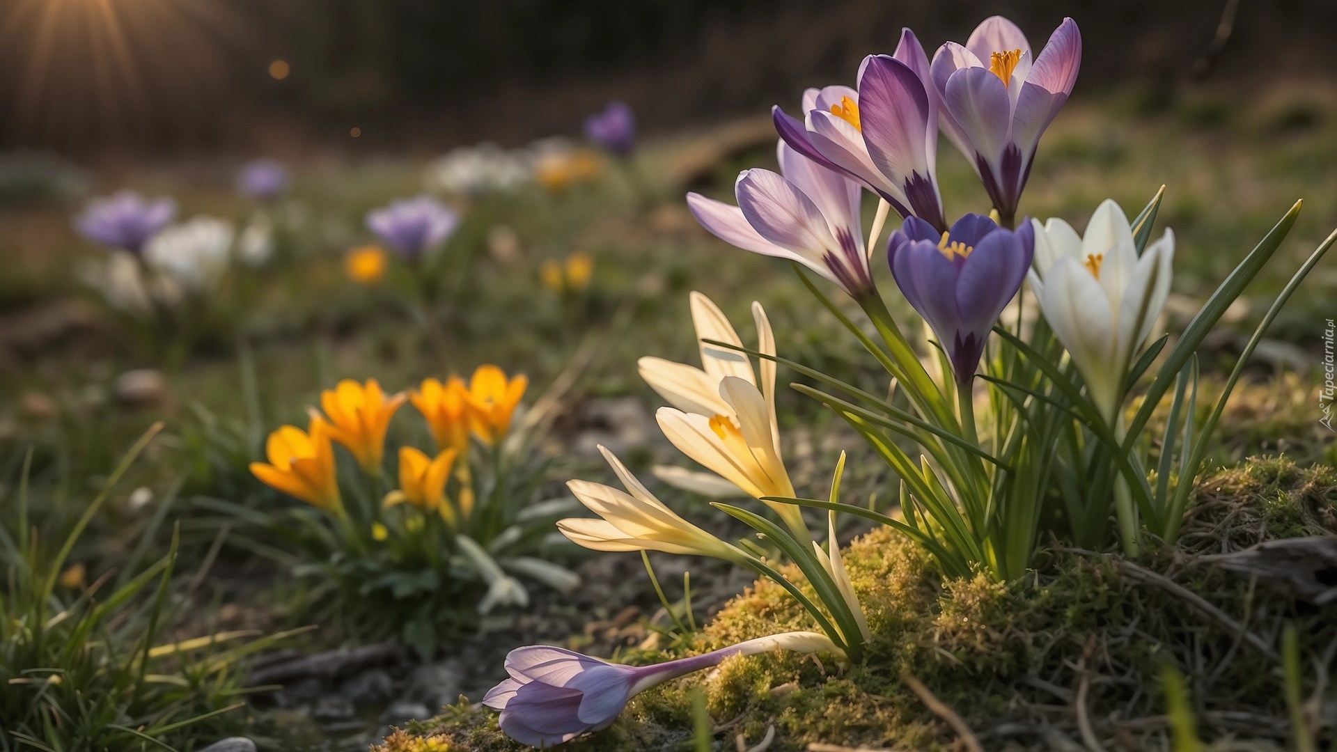 Edytor tapety: Kępki kolorowych krokusów w słonecznym blasku