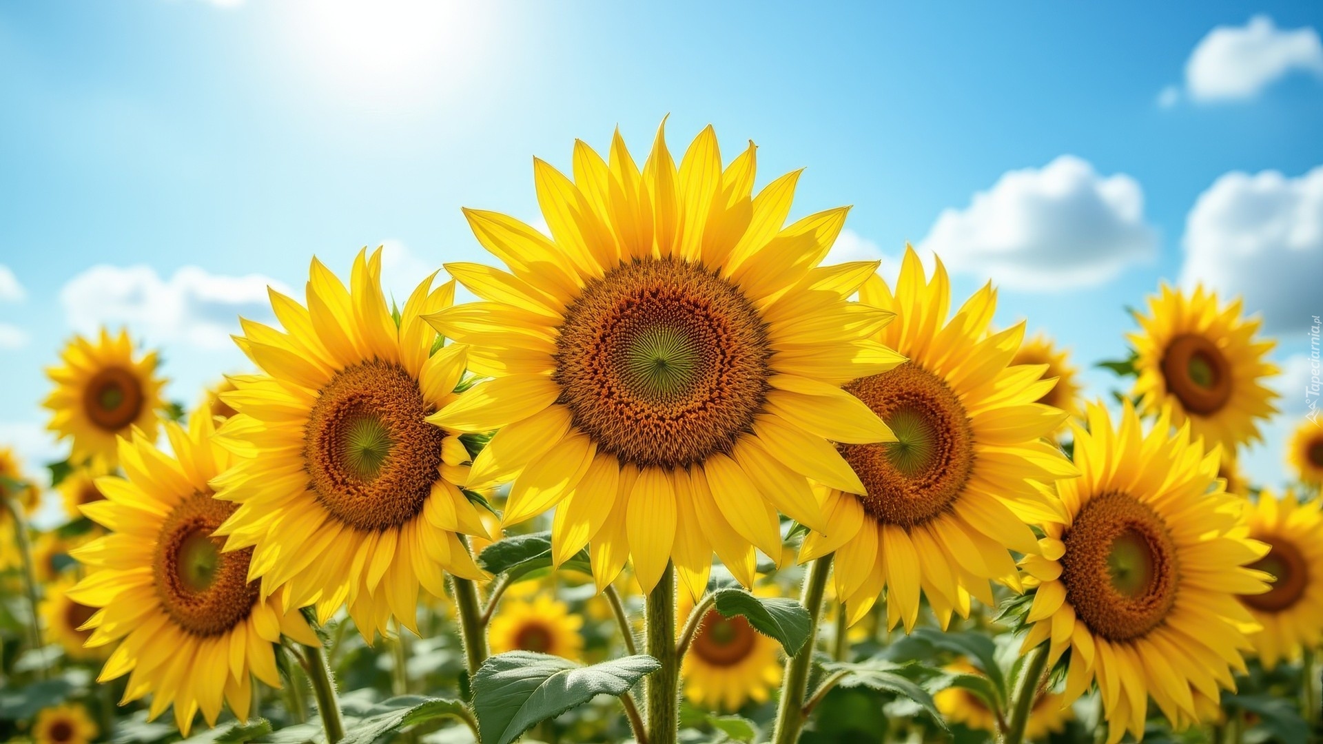 Edytor tapety: Kwitnące słoneczniki w zbliżeniu na tle nieba