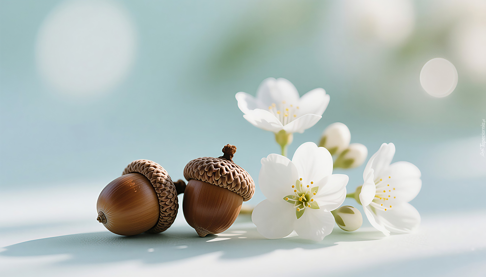 Edytor tapety: Dwa żołędzie obok białych kwiatów
