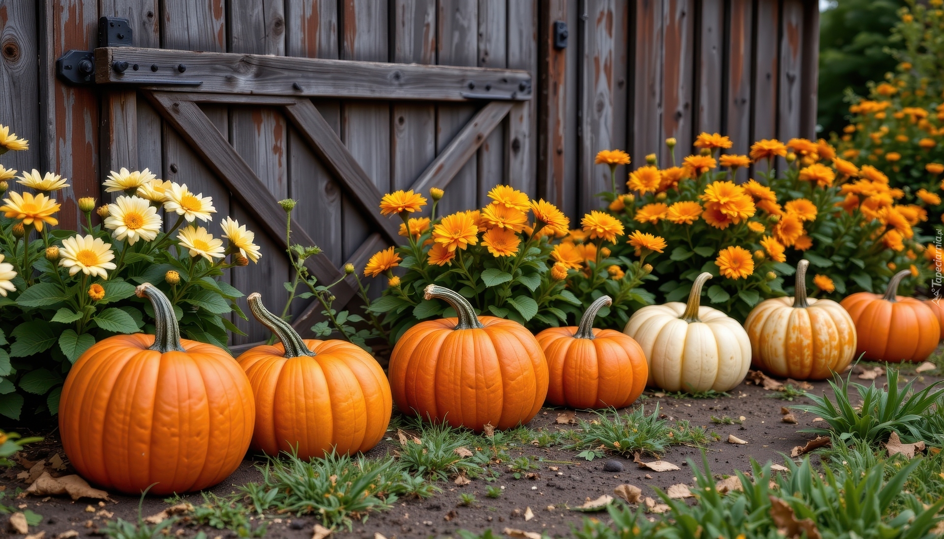 Edytor tapety: Dynie i pomarańczowe kwiaty pod drewnianym płotem
