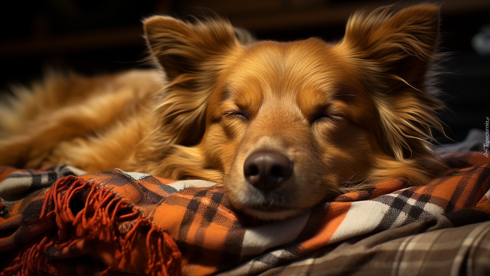 Edytor tapety: Śpiący brązowy pies na kraciastym kocu