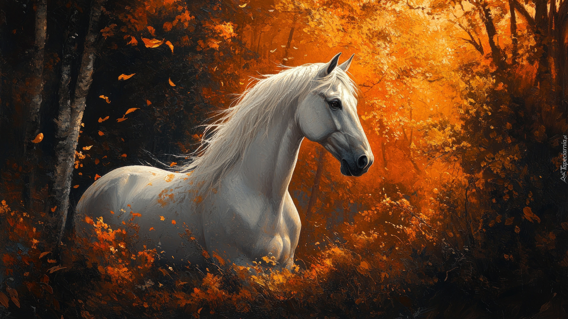 Edytor tapety: Siwy koń stojący wśród jesiennej roślinności i drzew