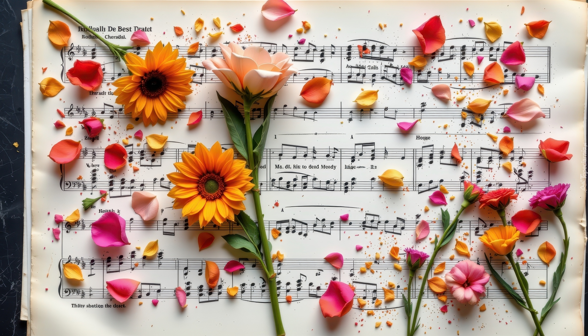 Edytor tapety: Kolorowe kwiaty i płatki na nutach