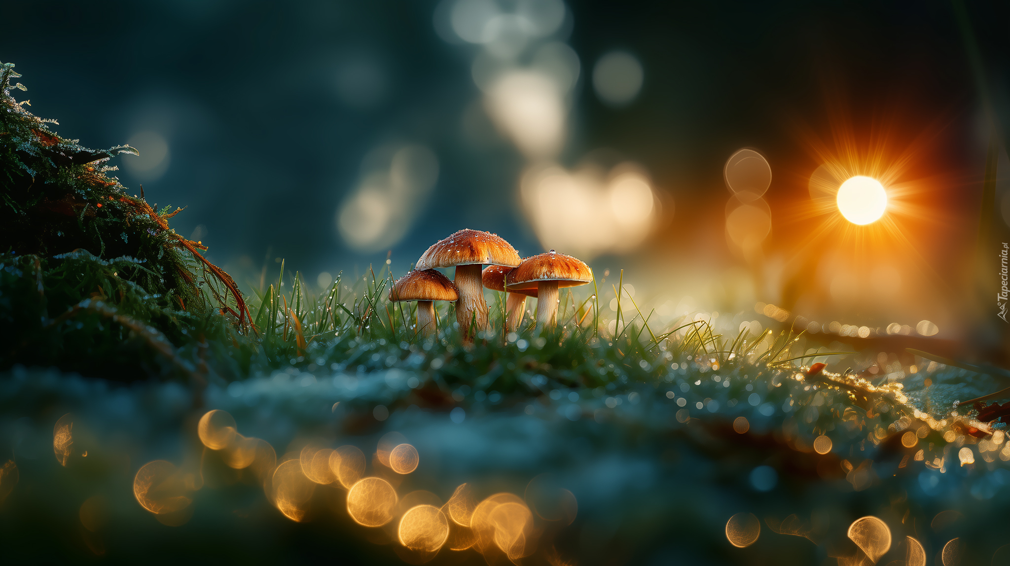 Edytor tapety: Cztery grzyby w mokrej trawie