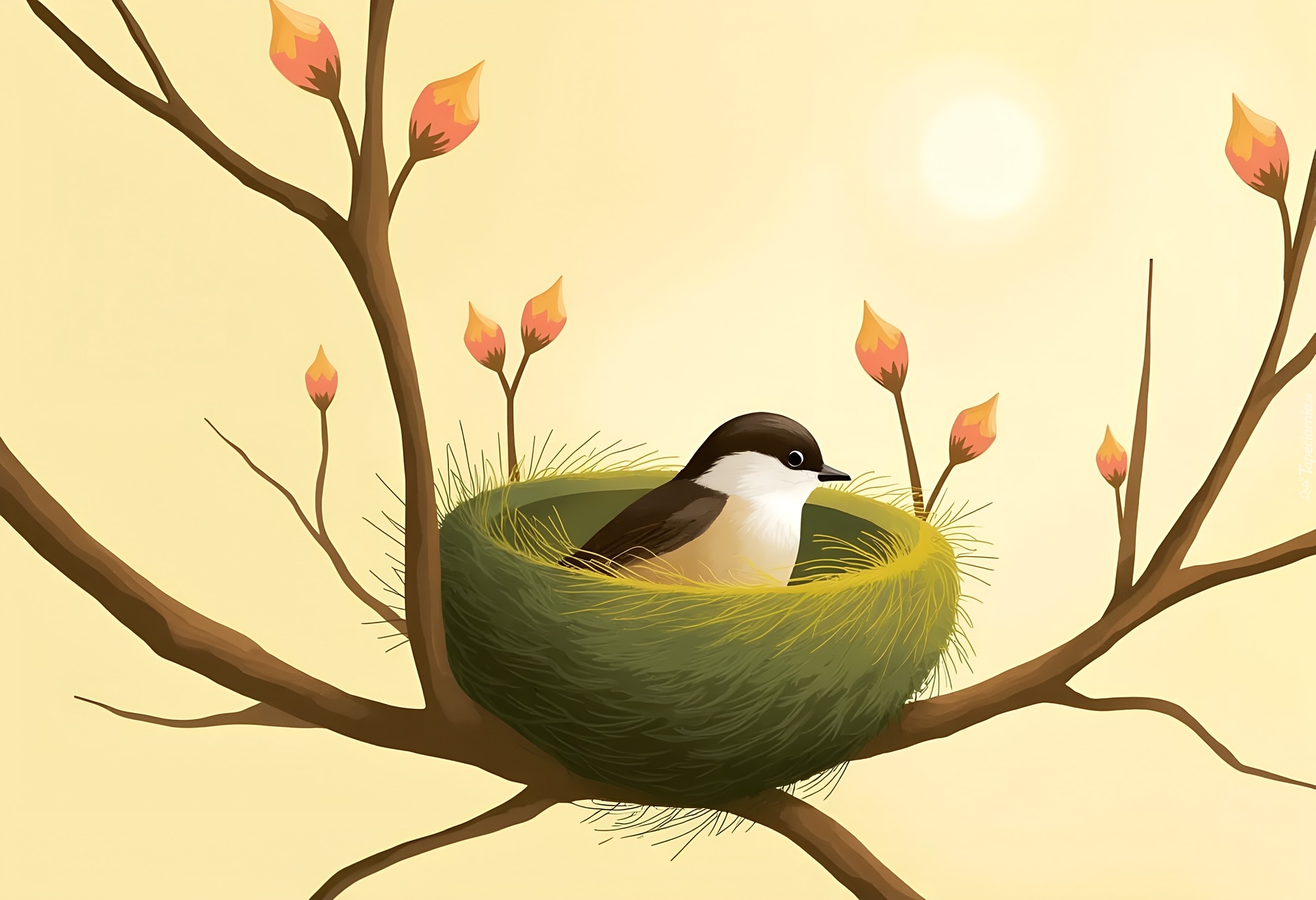 Edytor tapety: Ptak w gniazdku na gałązkach z liśćmi