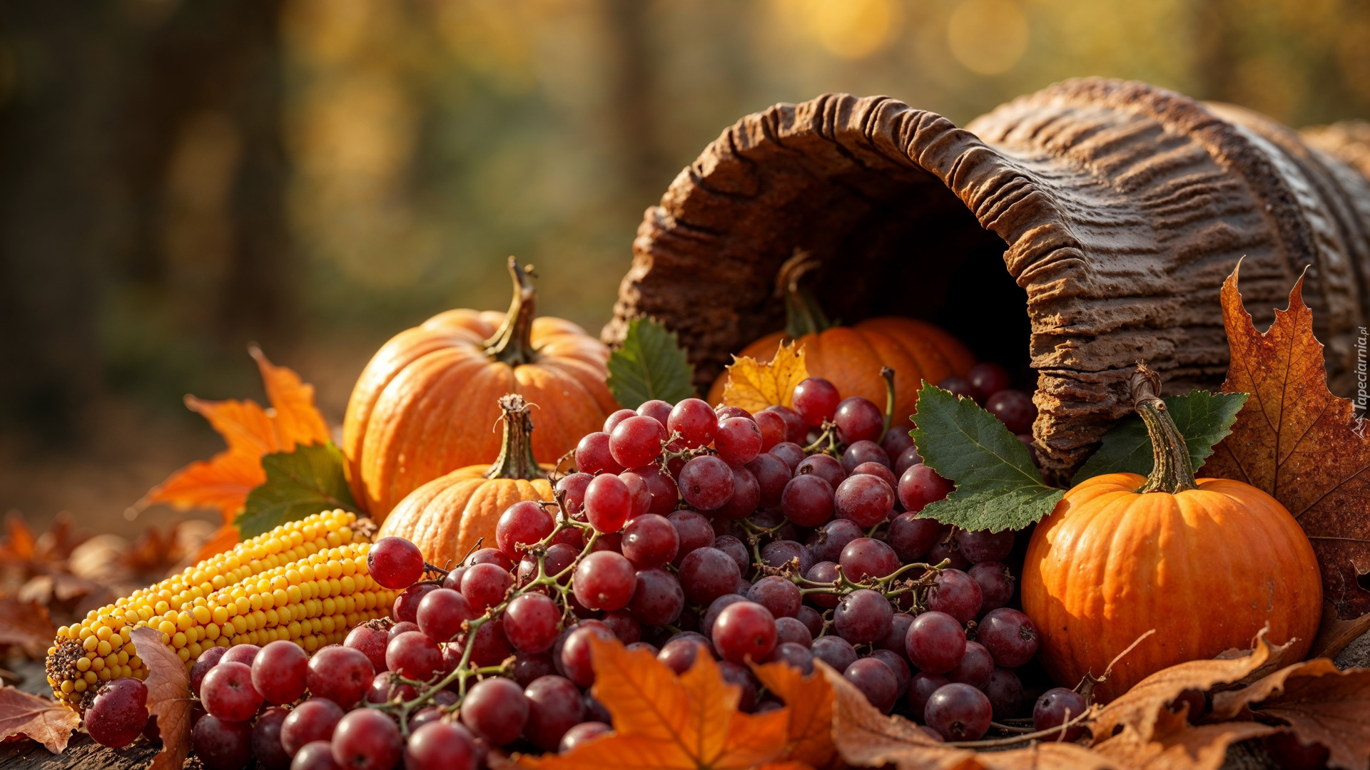 Edytor tapety: Kiście winogron oraz dynie i kukurydza obok naczynia