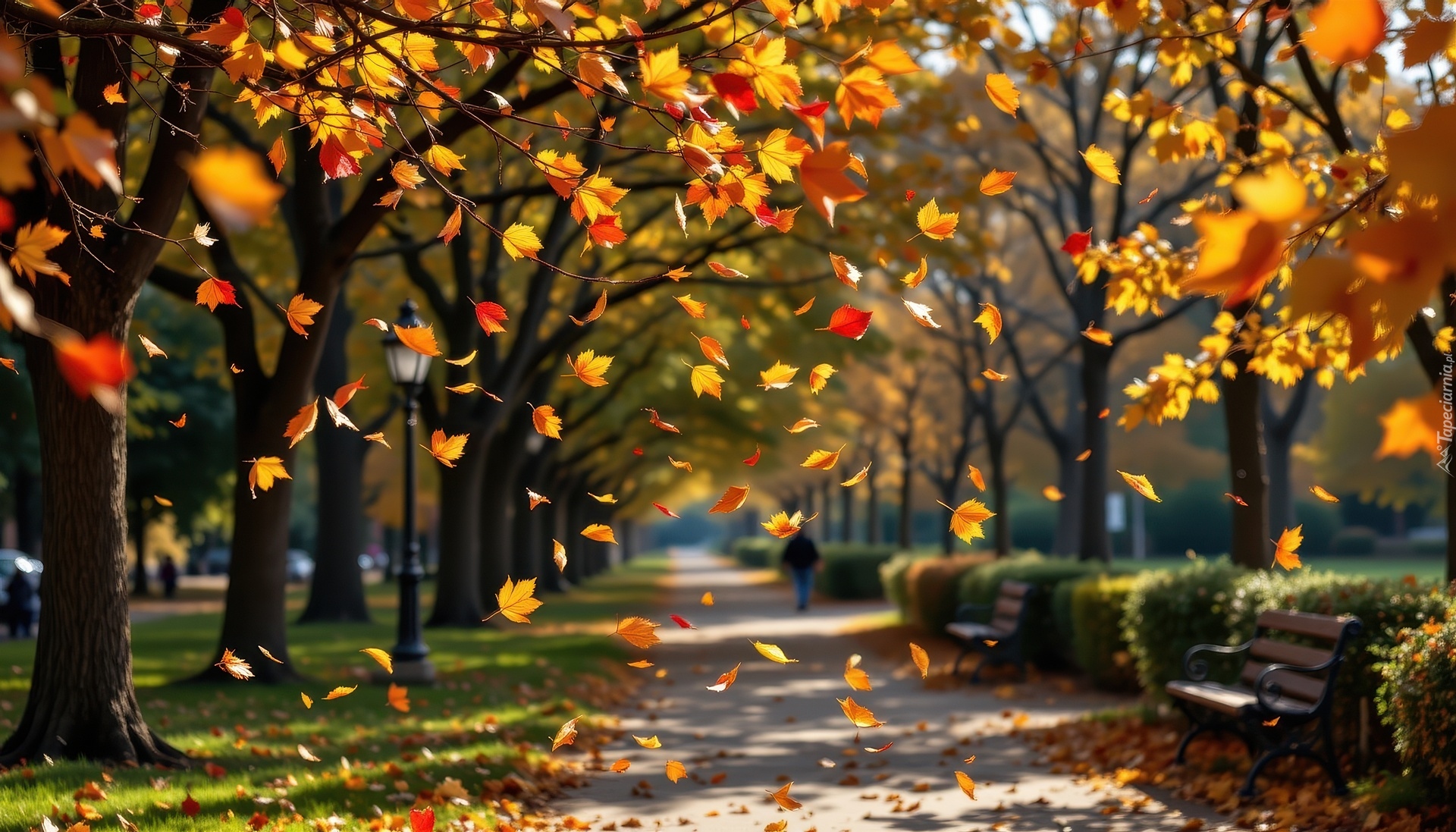 Edytor tapety: Spadające z drzew jesienne liście w parku