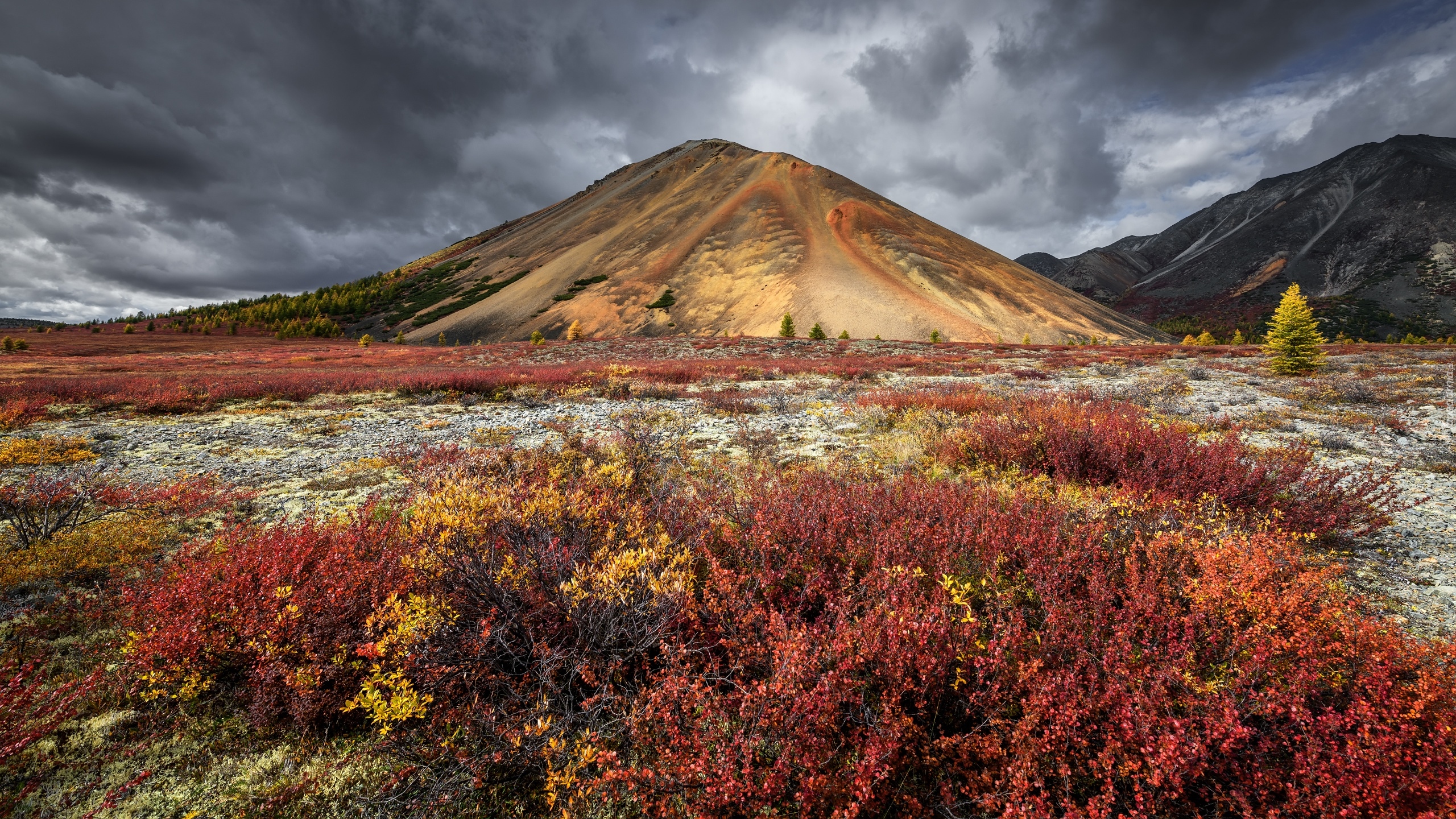 Edytor tapety: Jesienne rośliny i Góry Kołymskie pod ciemnymi chmurami