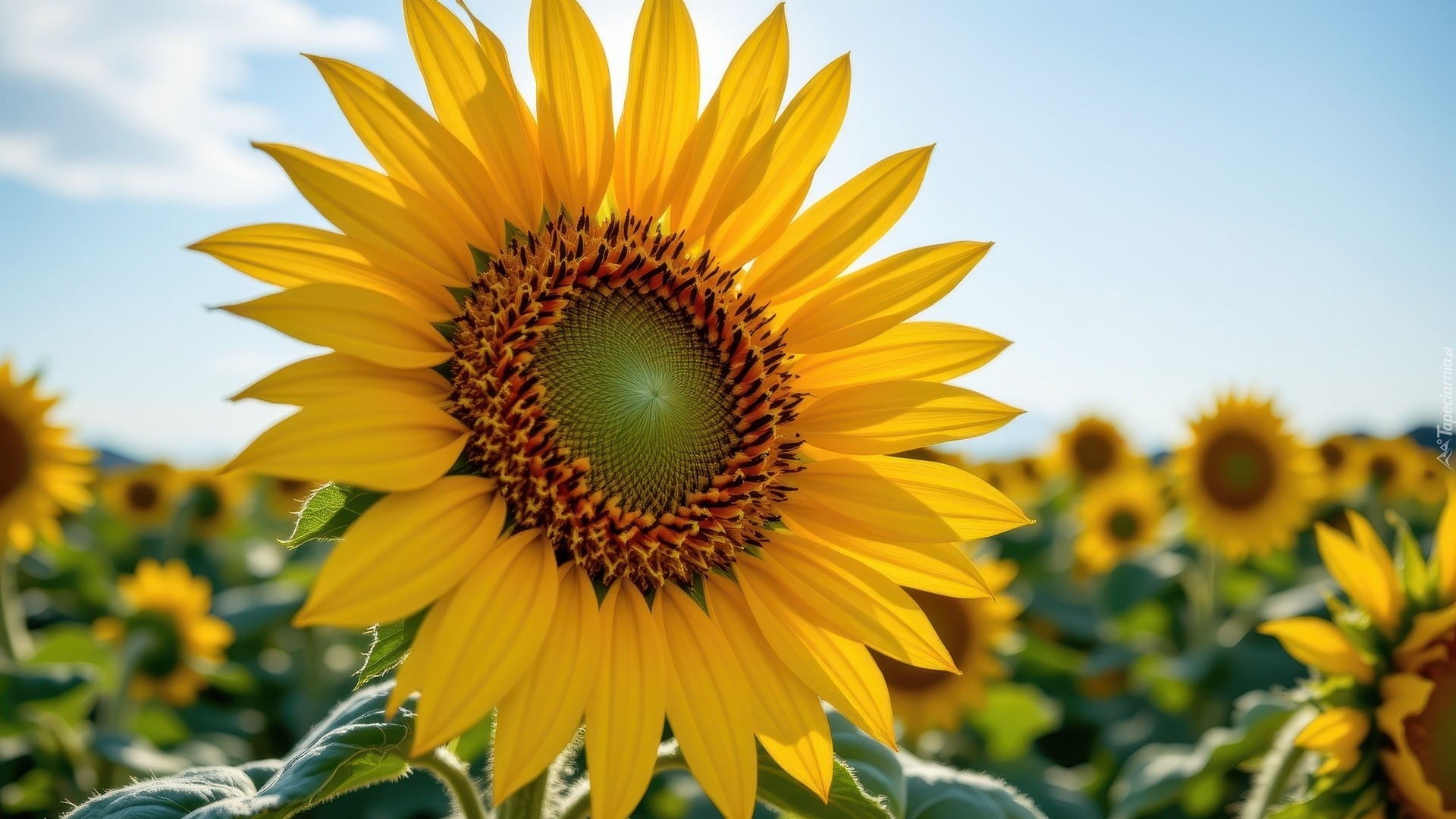 Edytor tapety: Kwitnący słonecznik w zbliżeniu na tle nieba