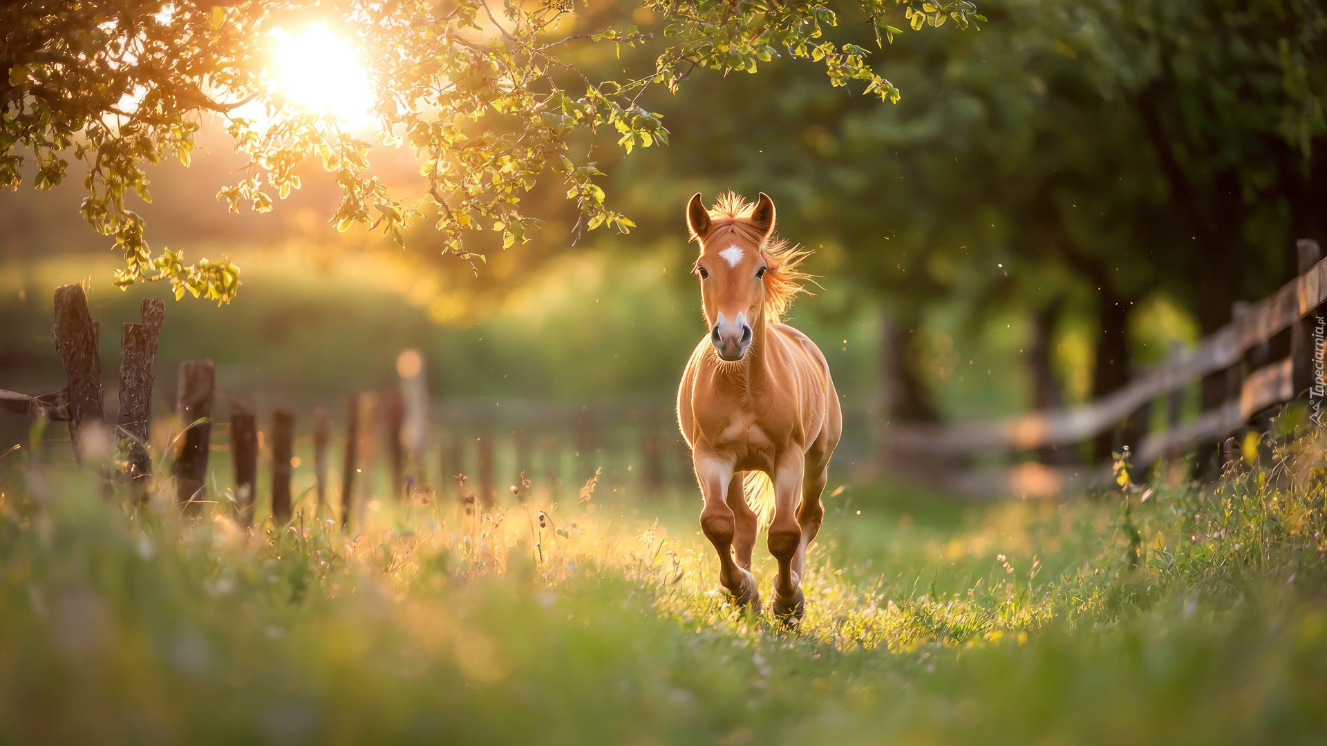 Edytor tapety: Galopujący koń po trawie w słonecznym blasku