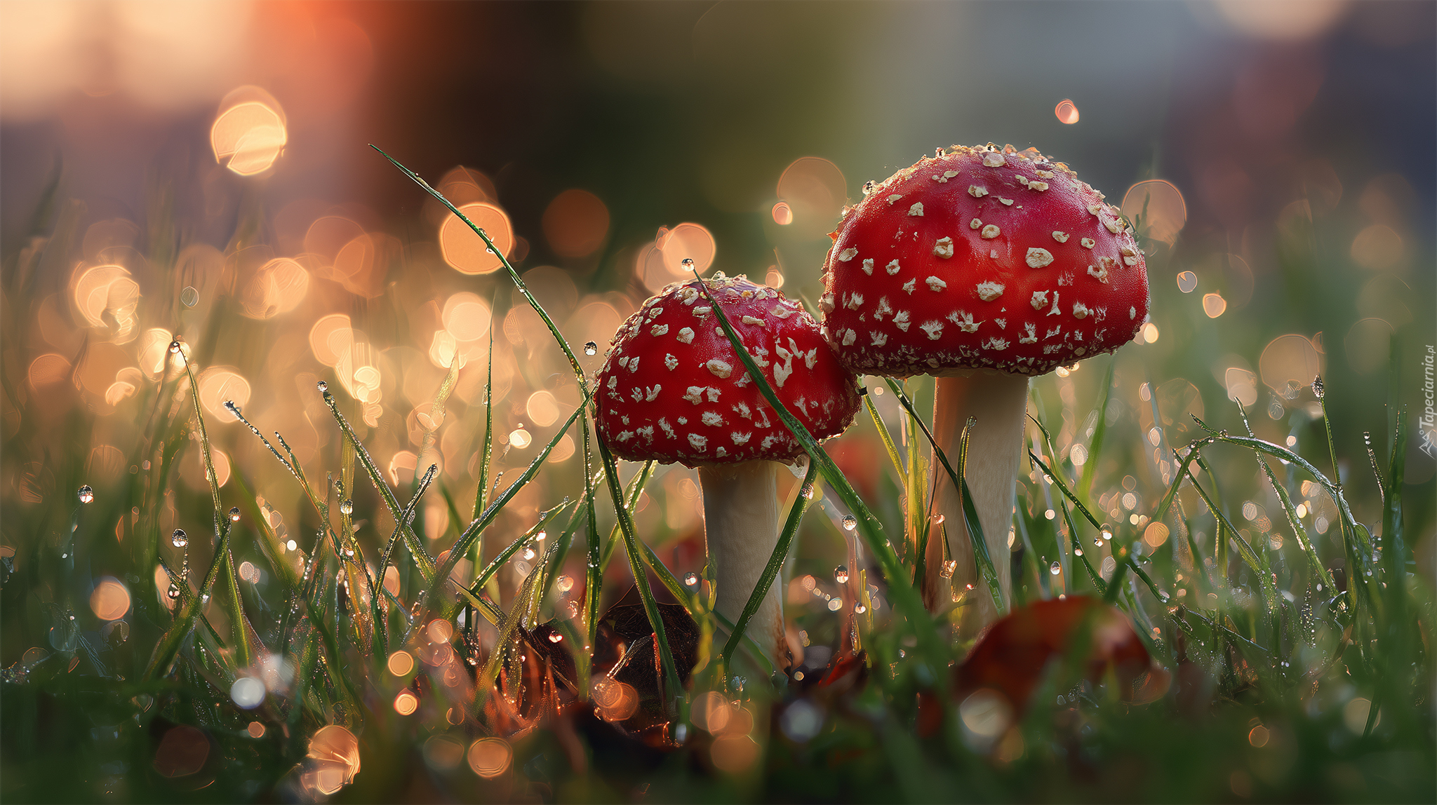 Edytor tapety: Dwa muchomory w mokrej trawie na rozświetlonym tle
