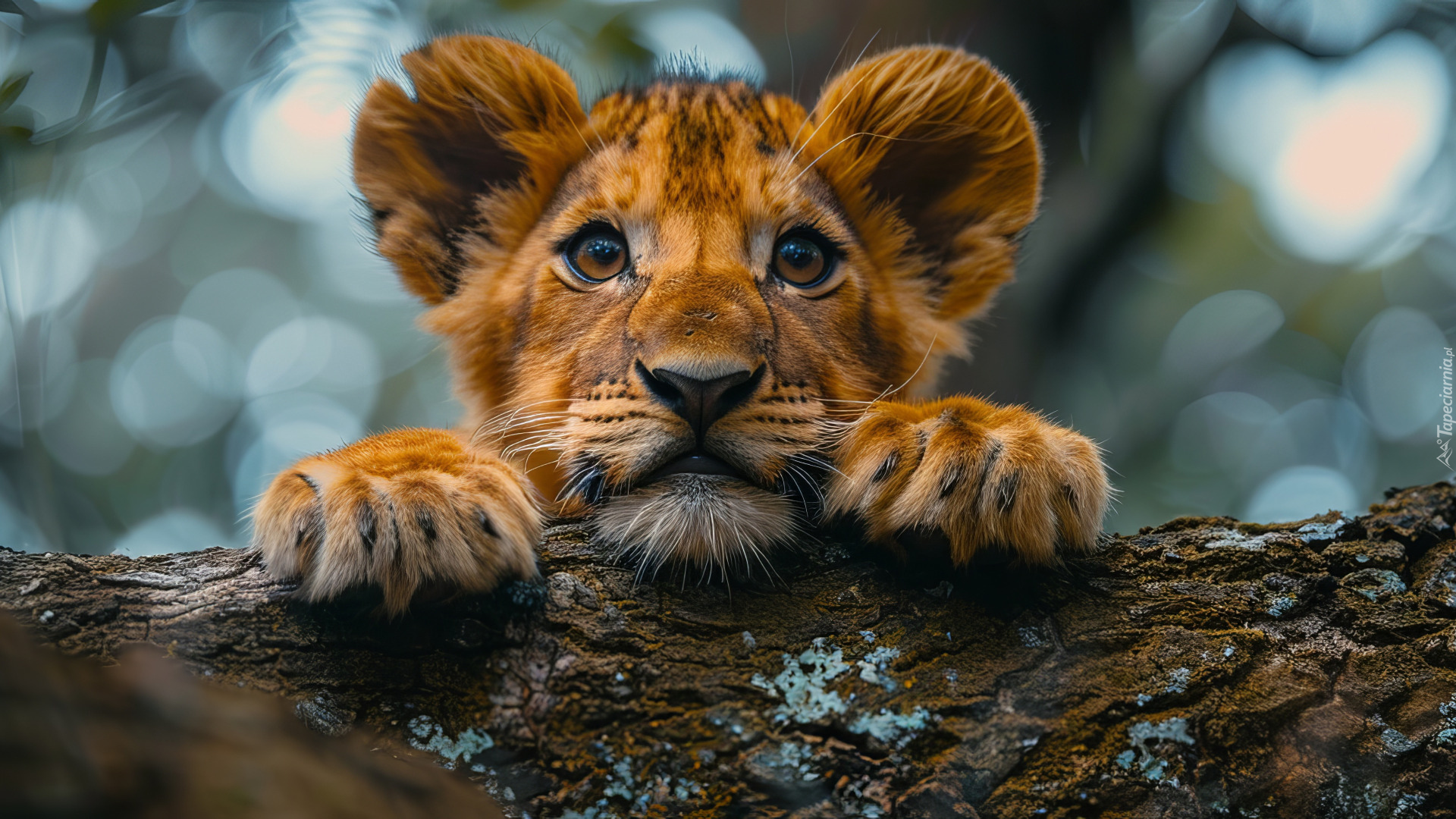Edytor tapety: Głowa i łapy małego lwa na konarze drzewa