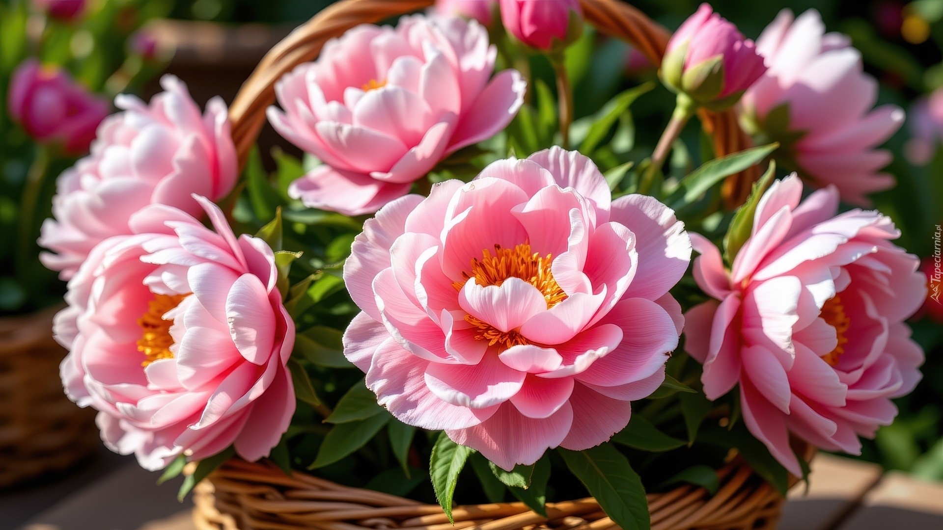 Edytor tapety: Rozświetlone różowe piwonie w wiklinowym koszyku