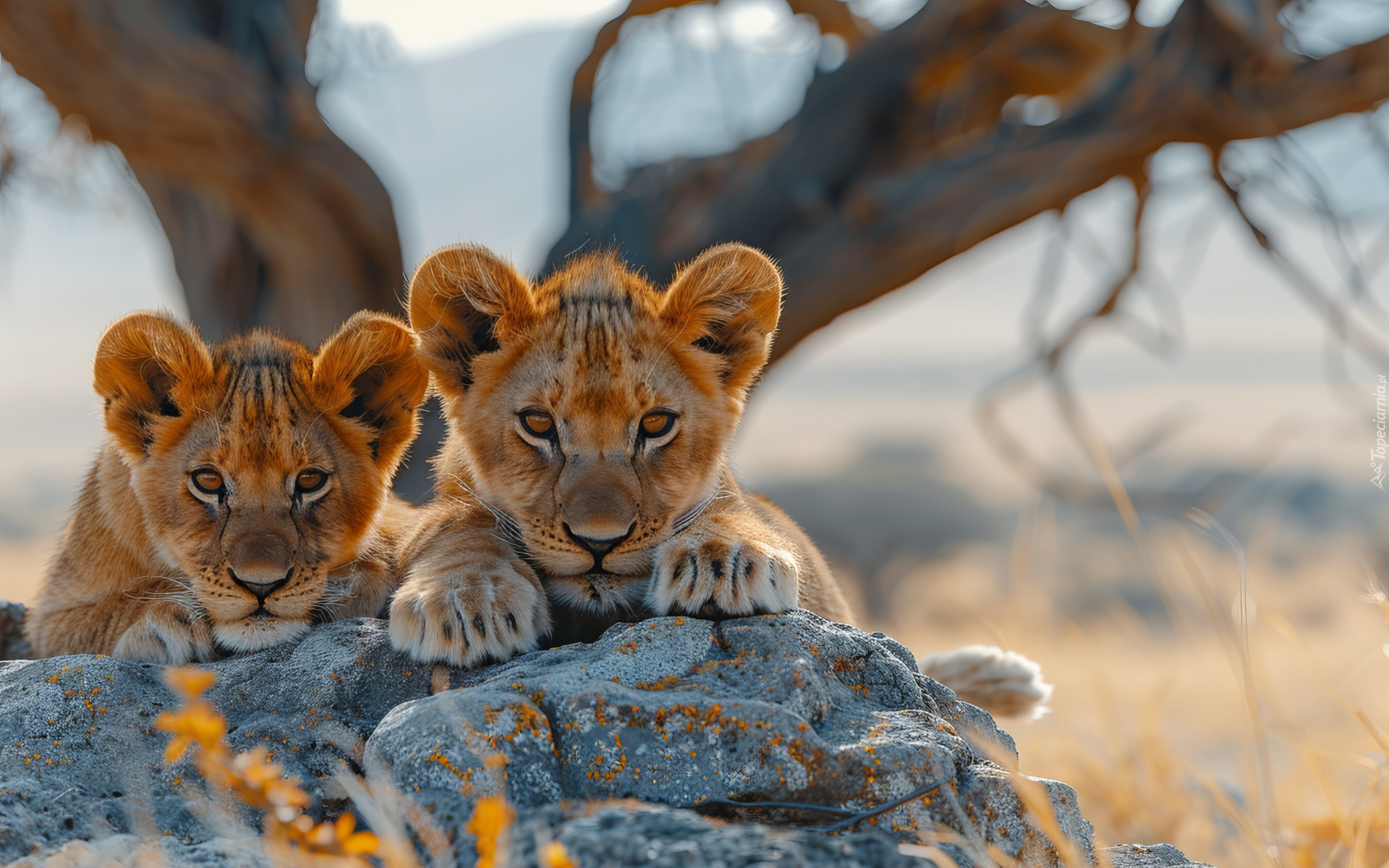 Edytor tapety: Dwa lwiątka oparte łapkami o kamienie pod drzewem