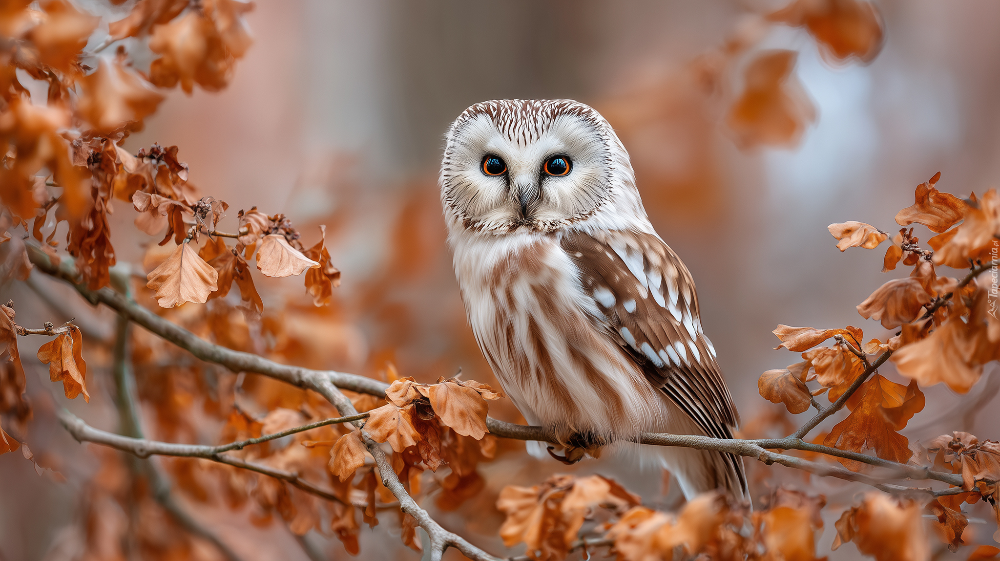 Edytor tapety: Sowa włochatka na gałęzi z suchymi jesiennymi liśćmi