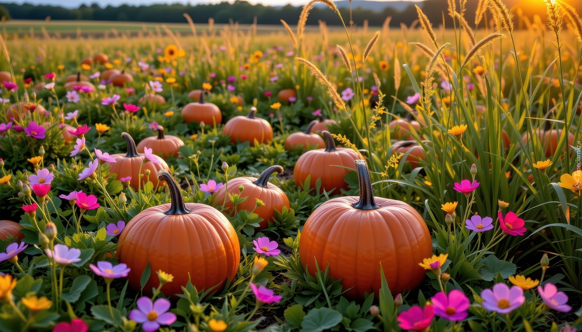 Edytor tapety: Dynie leżące wśród kwiatów i trawy na łące