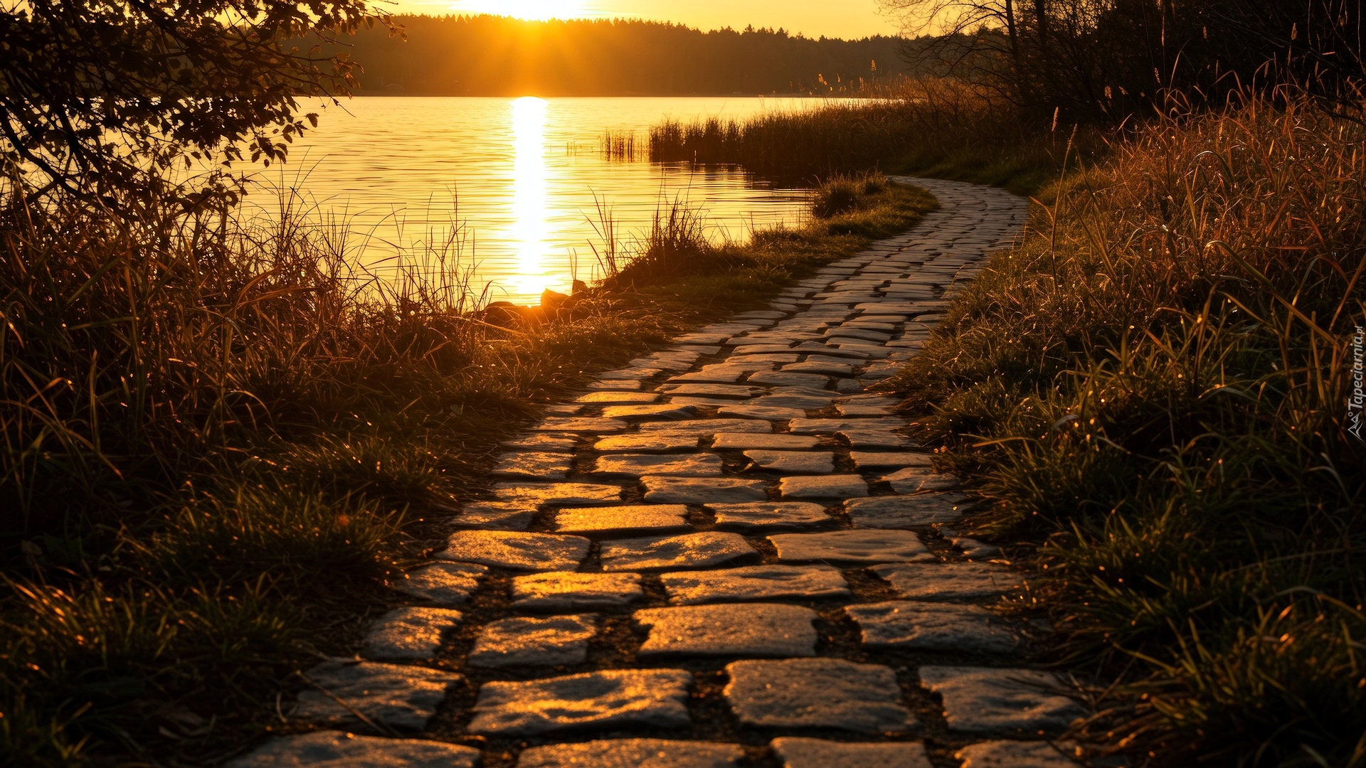 Edytor tapety: Kamienna ścieżka nad jeziorem w blasku zachodzącego słońca