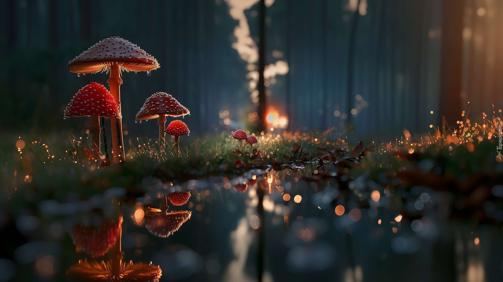 Edytor tapety: Odbicie muchomorów w wodzie w grafice AI