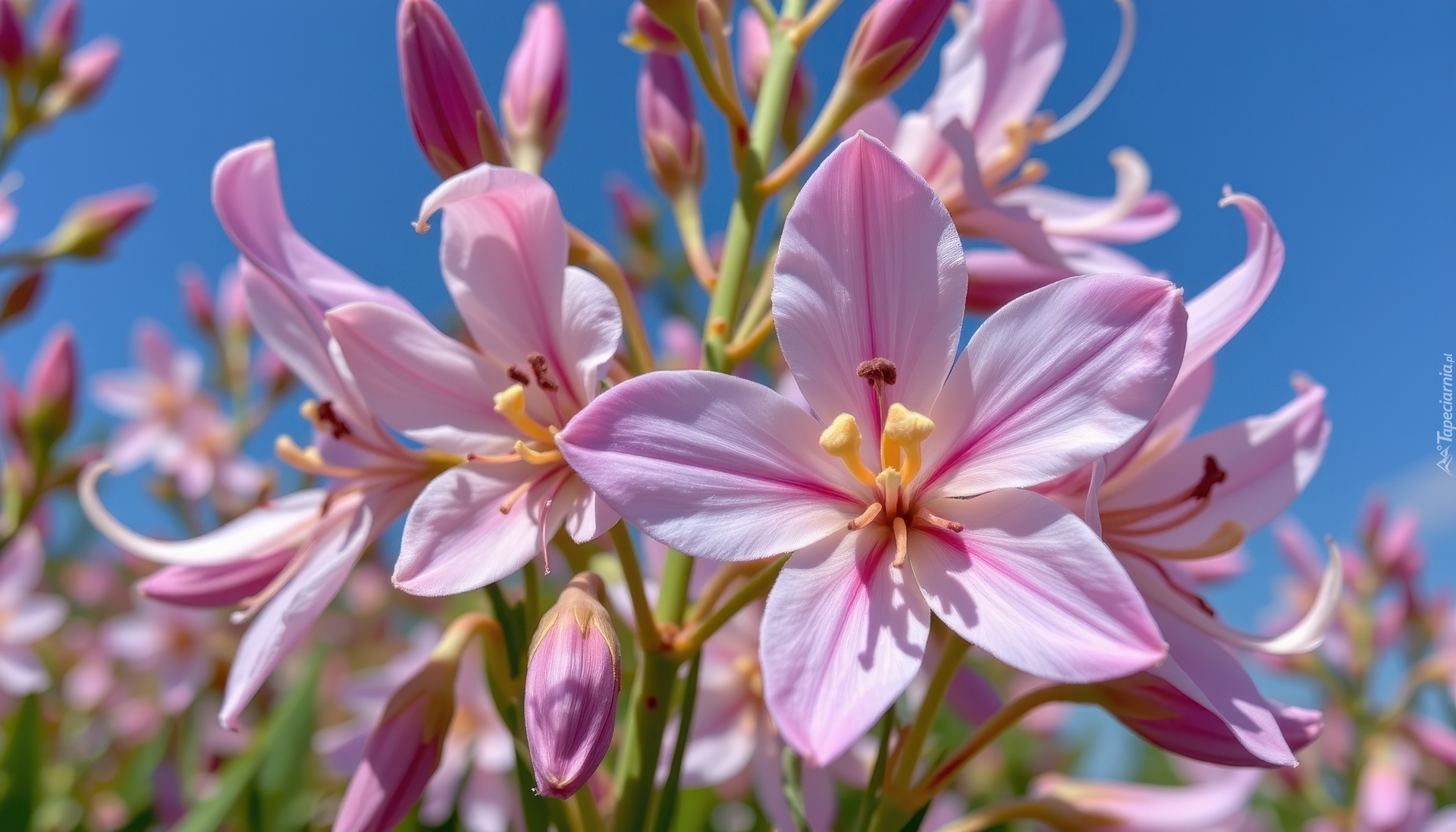 Edytor tapety: Rozświetlone różowe kwiaty na tle nieba w AI
