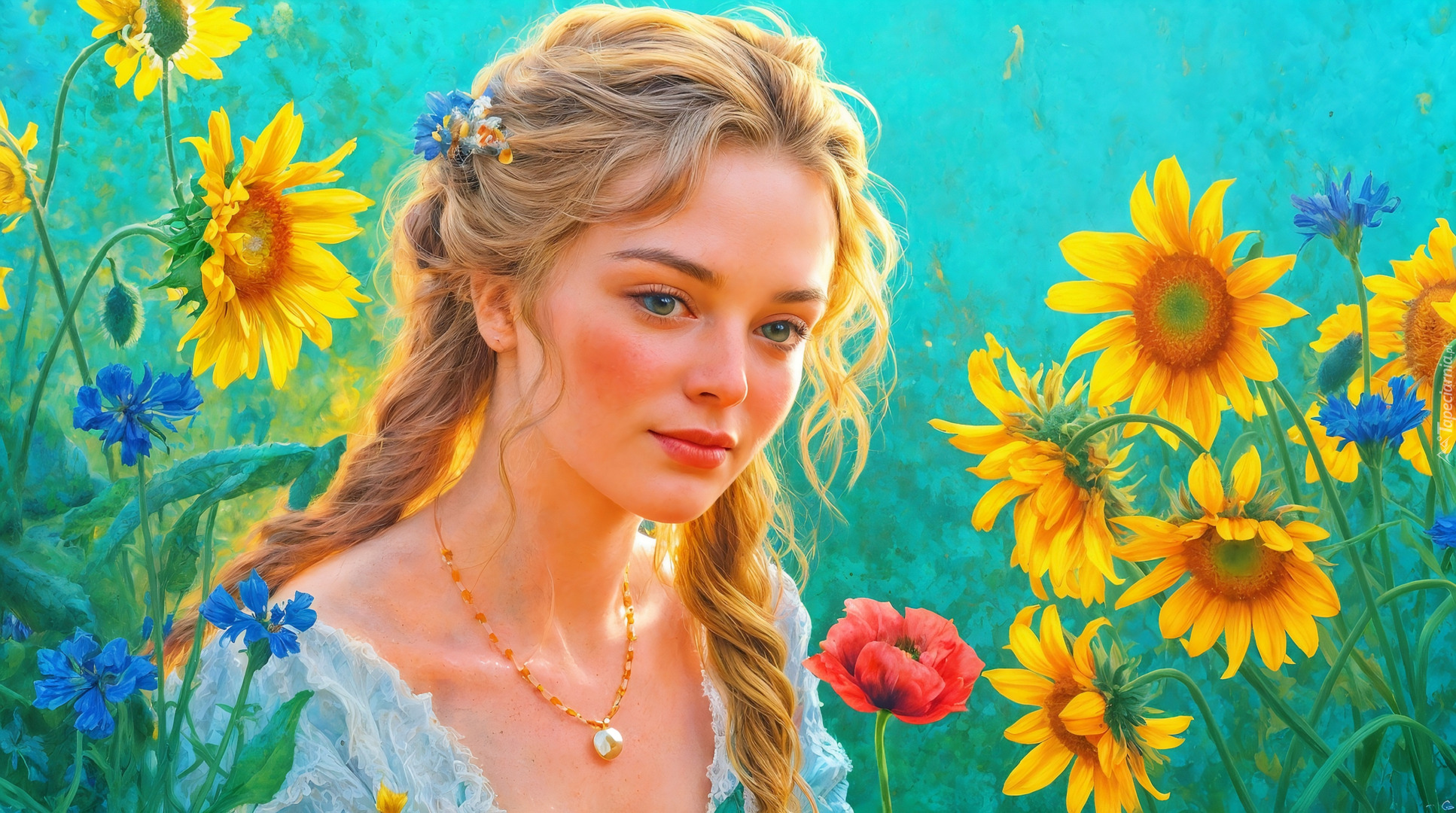 Edytor tapety: Blondynka z warkoczami wśród kwiatów