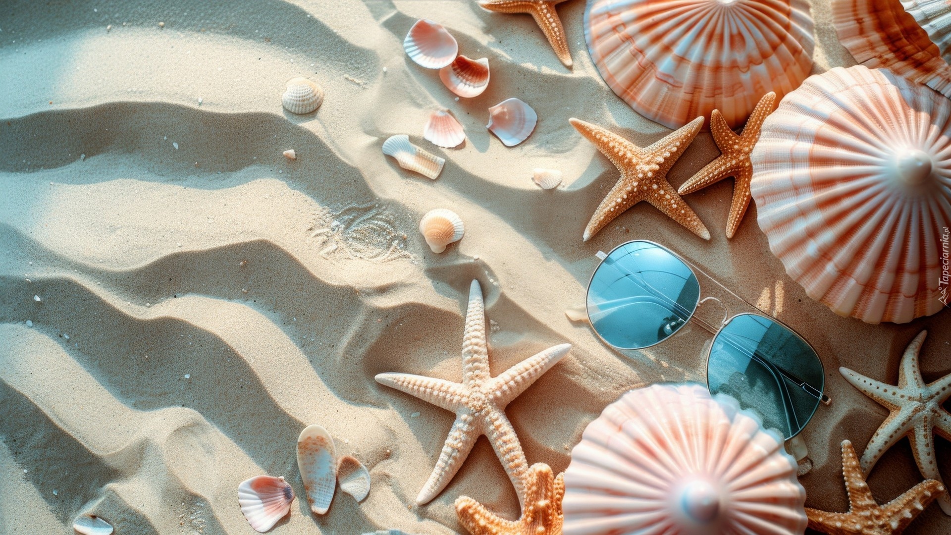 Edytor tapety: Okulary oraz muszelki i rozgwiazdy na piasku