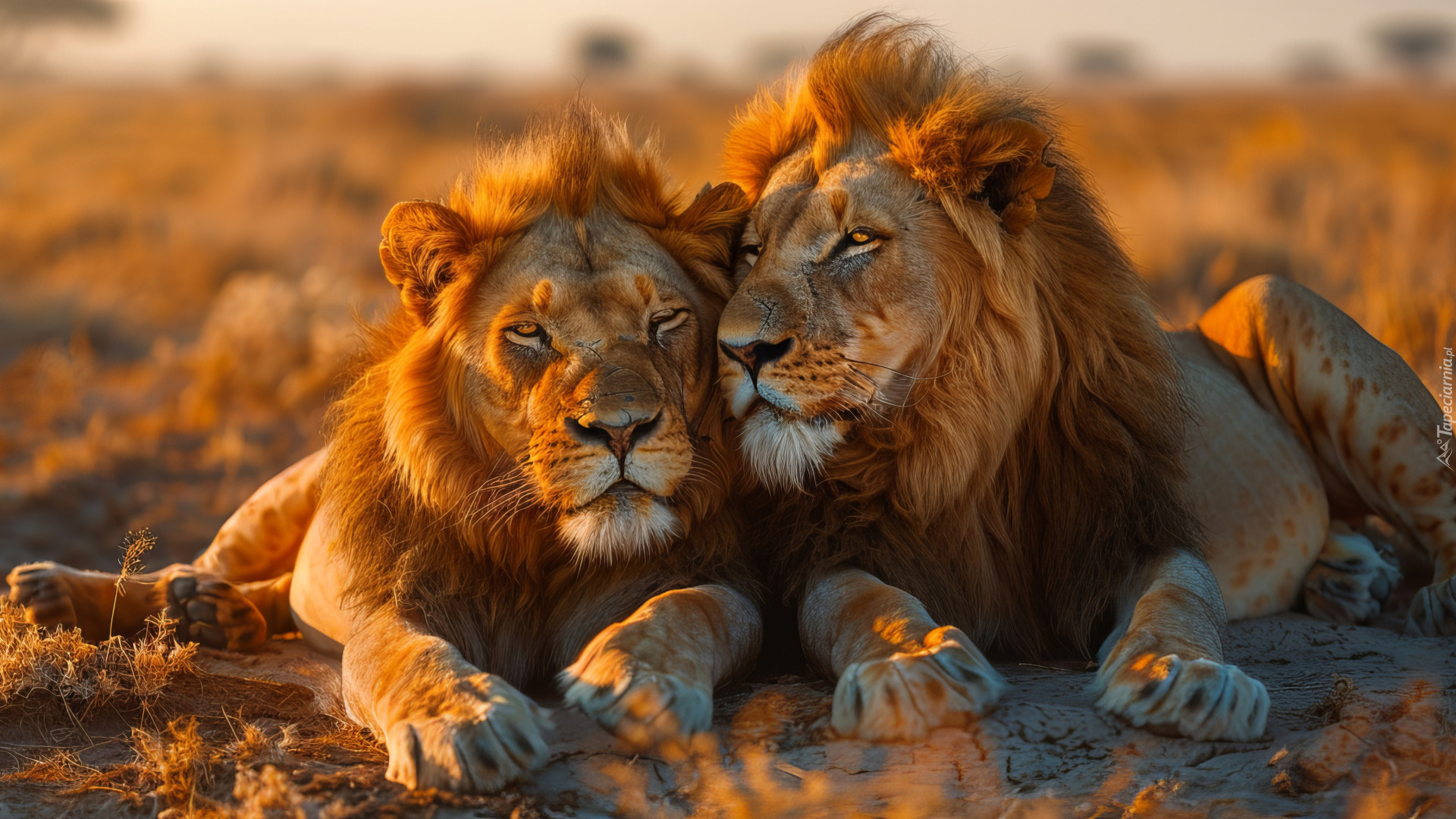 Edytor tapety: Dwa przytulone lwy leżące na skale