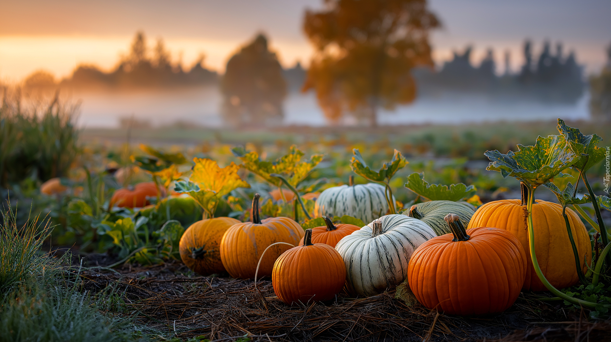 Edytor tapety: Białe i pomarańczowe dynie na zamglonym polu