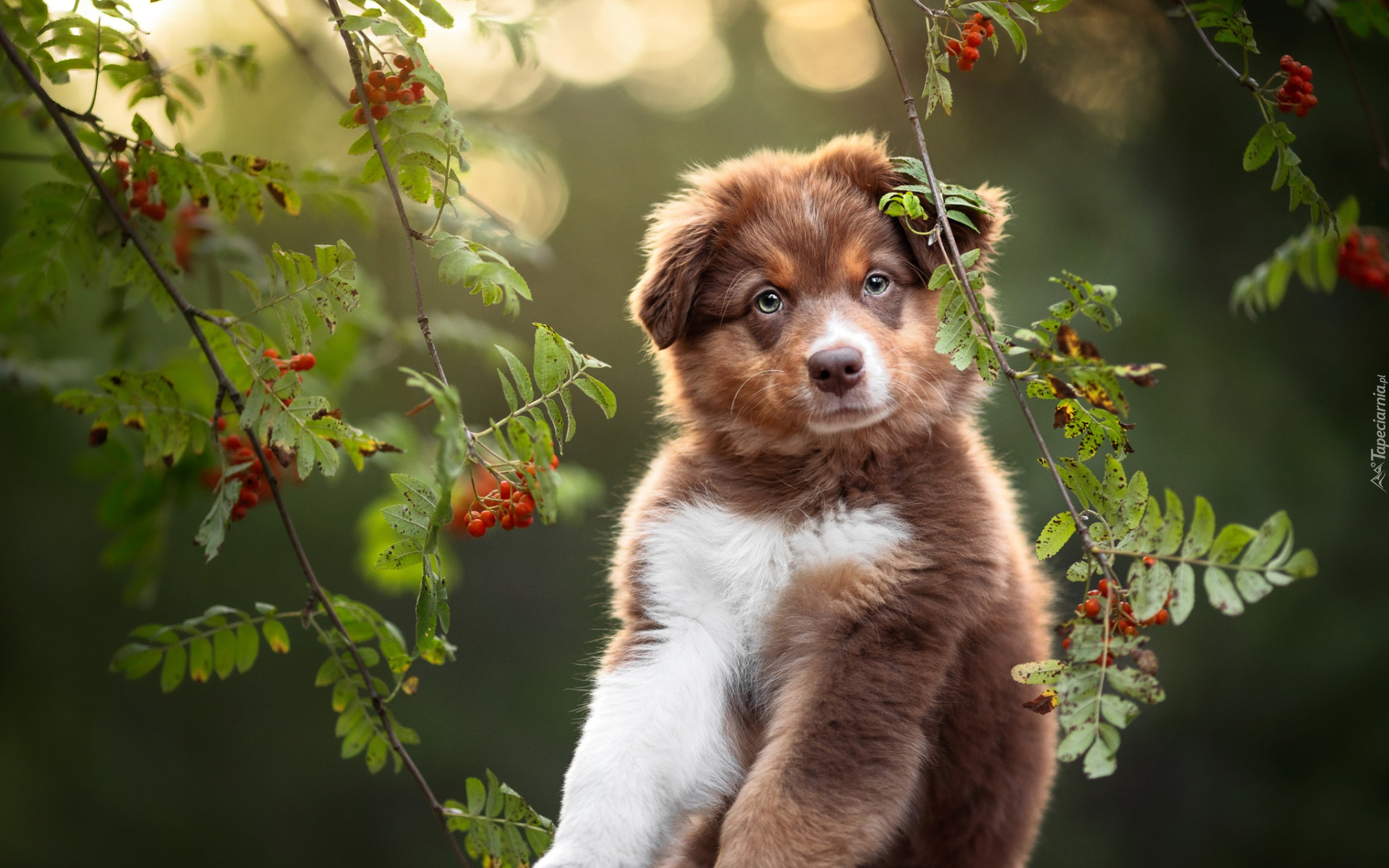 Edytor tapety: Biało-brązowy szczeniak owczarka australijskiego pod gałązkami jarzębiny