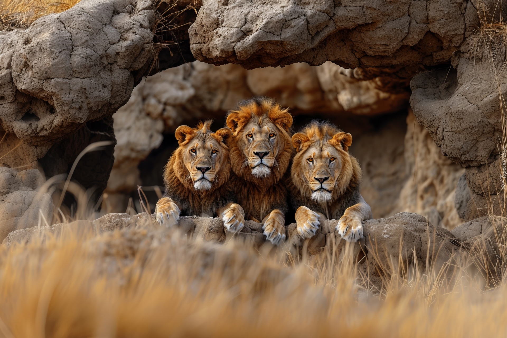 Edytor tapety: Trzy lwy leżące na skale w grafice AI