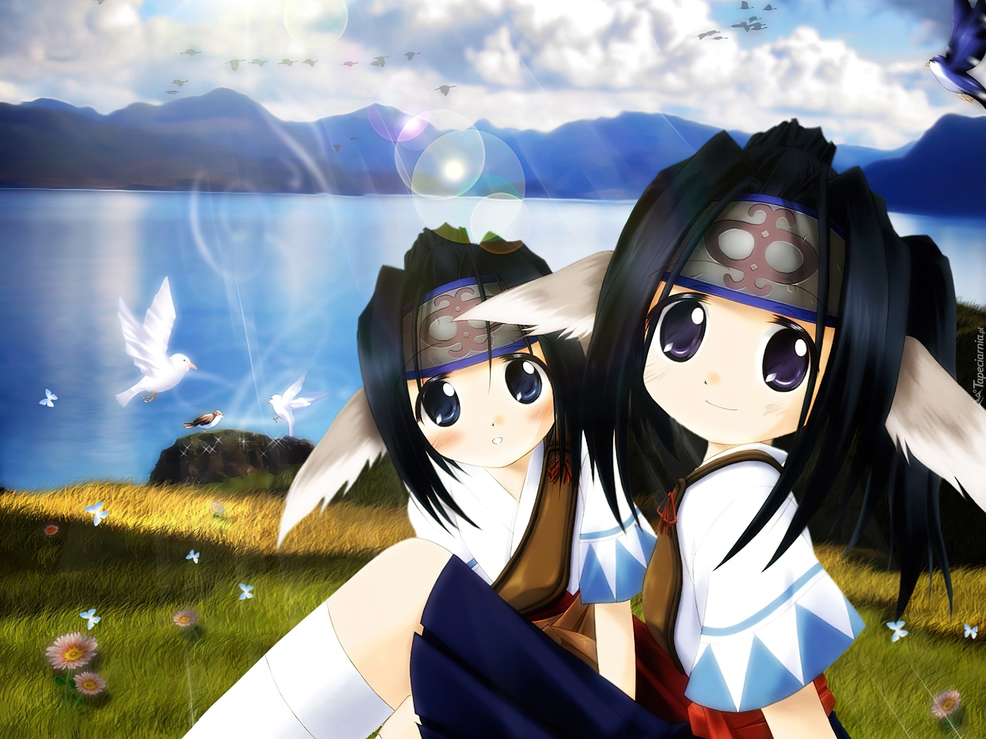 Edytor tapety: Utawarerumono, dziewczynki, woda, ptaki