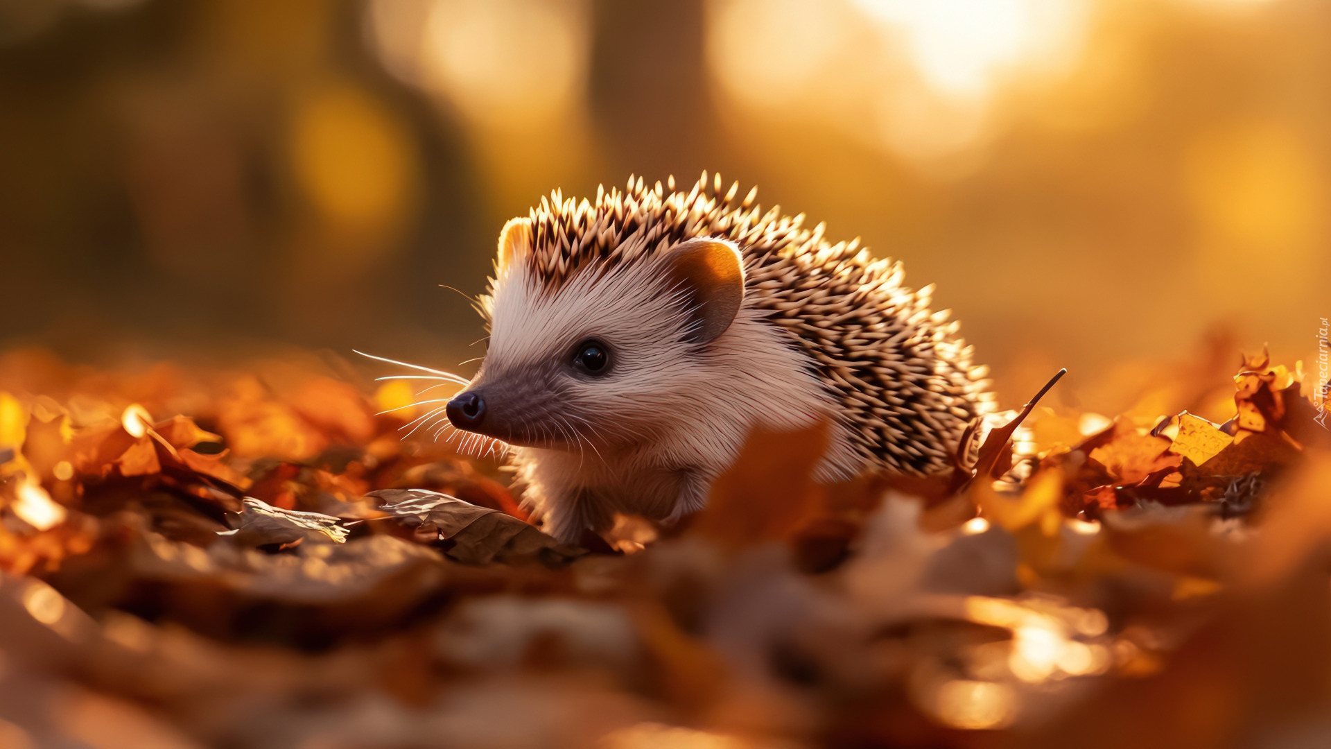 Edytor tapety: Jeż na opadłych jesiennych liściach na rozświetlonym tle