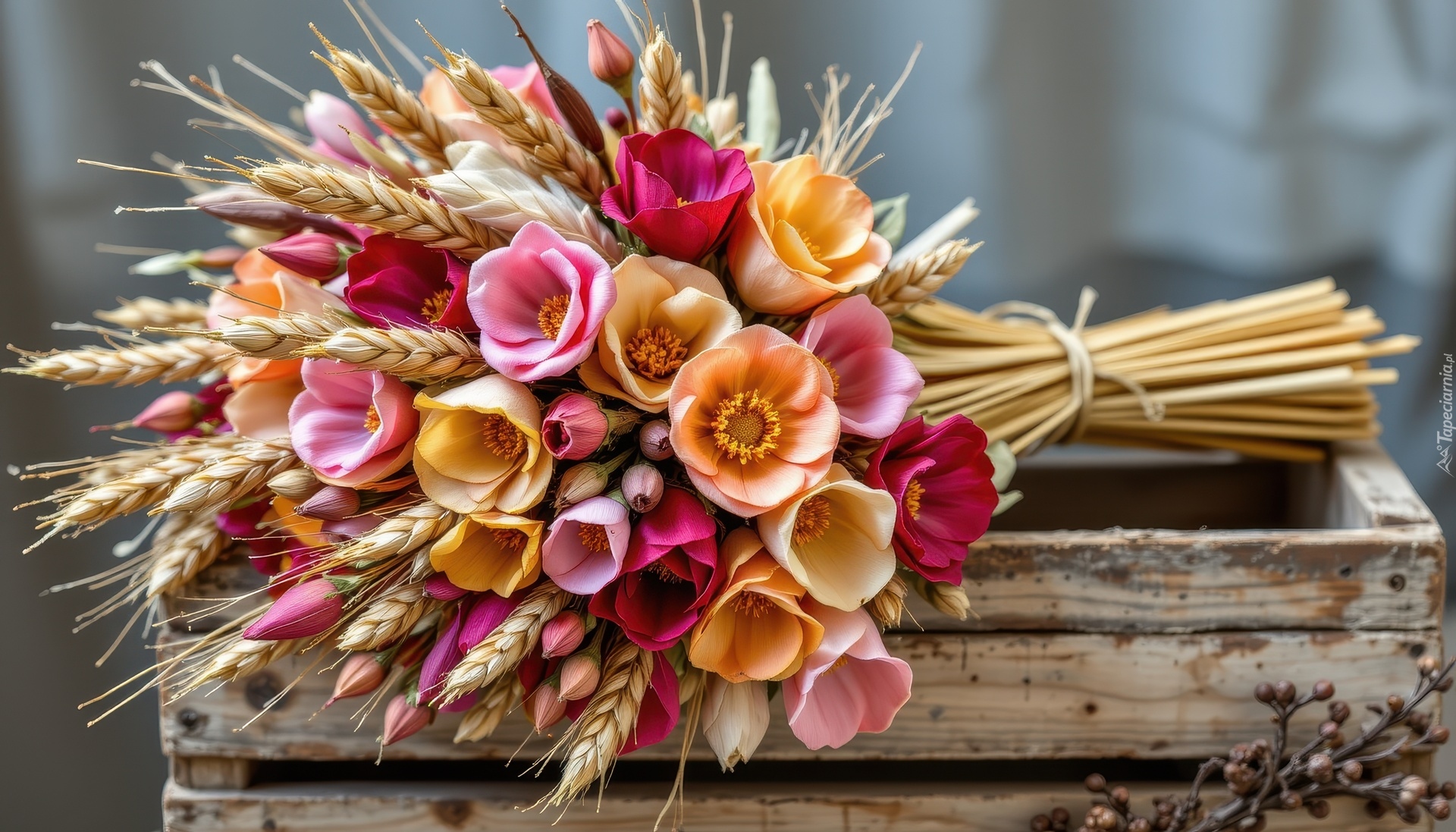 Edytor tapety: Bukiet kwiatów z kłosami zboża na skrzynce