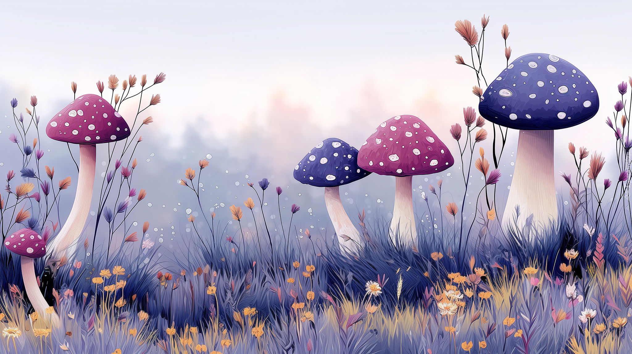 Edytor tapety: Kolorowe muchomory i kwiaty w trawie