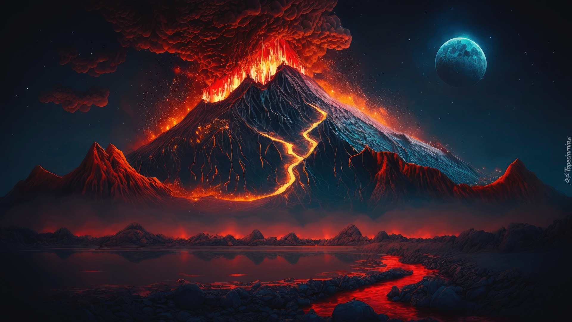 Edytor tapety: Erupcja wulkanu z ogniem i lawą nocną porą