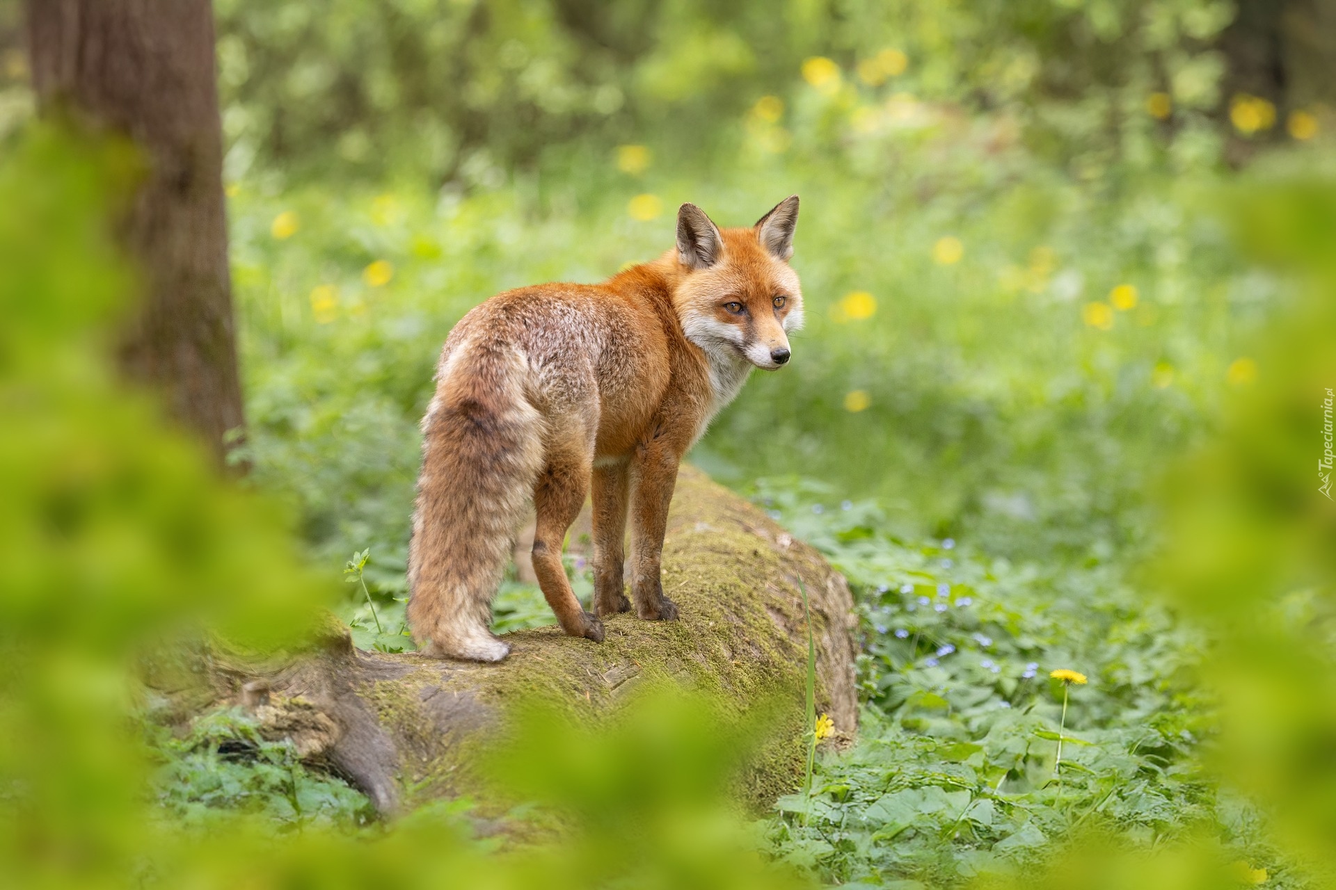 Edytor tapety: Rudy lis na leżącym omszałym pniu