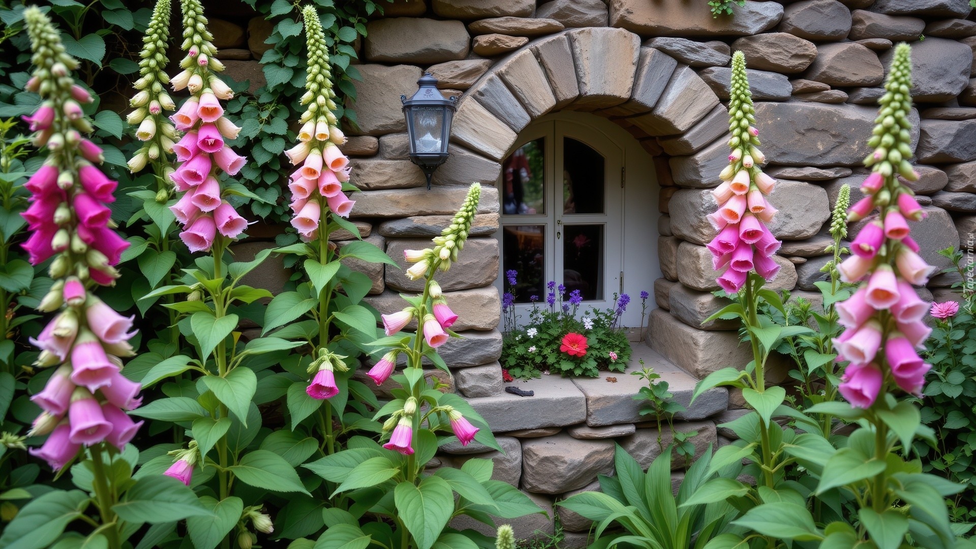 Edytor tapety: Różowe kwiaty naparstnicy przy oknie i kamiennej ścianie