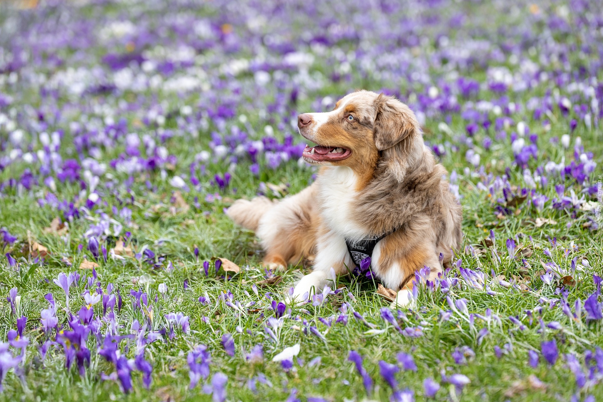 Edytor tapety: Leżący owczarek australijski wśród krokusów na łące