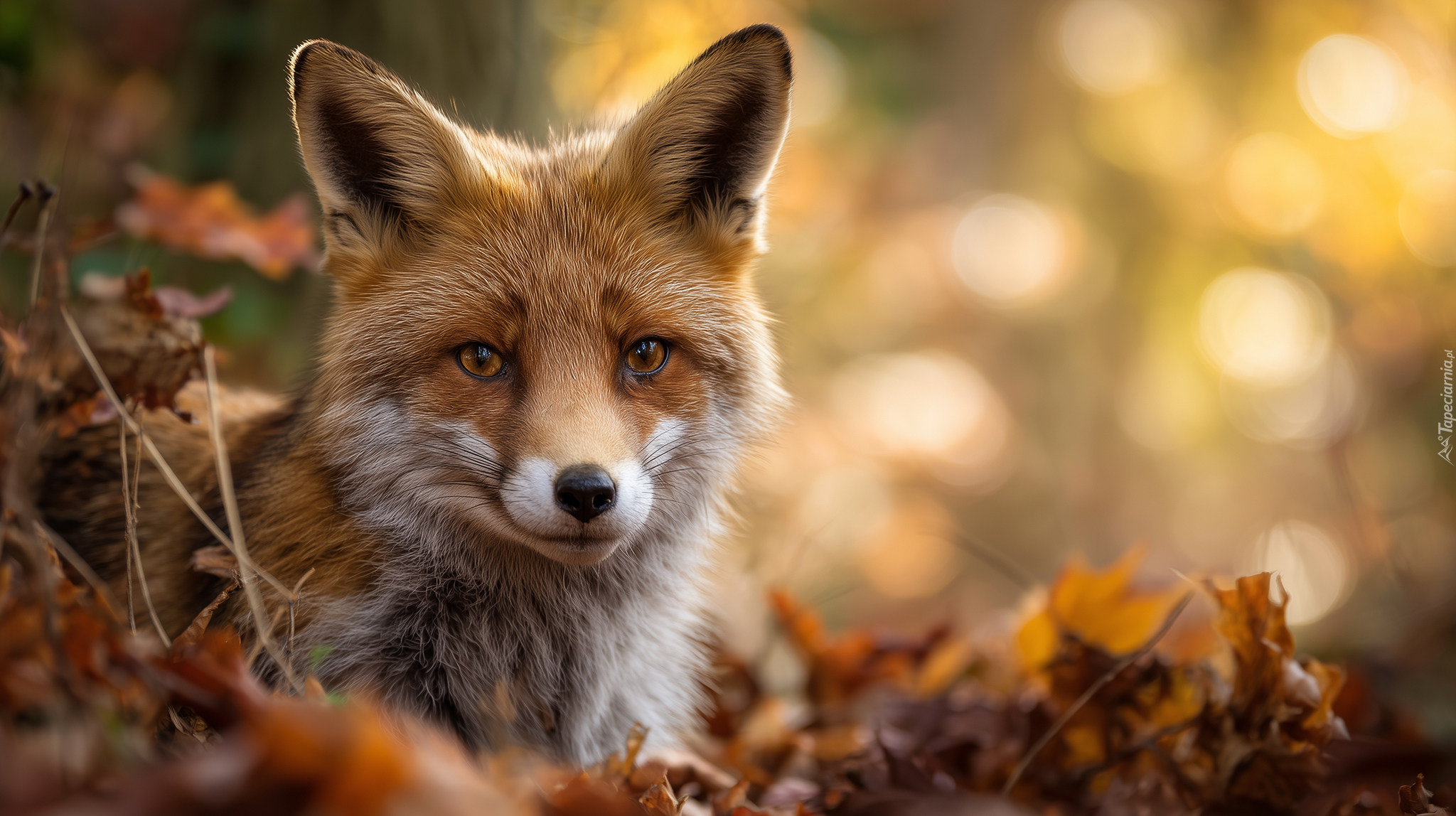 Edytor tapety: Lis leżący na suchych jesiennych liściach