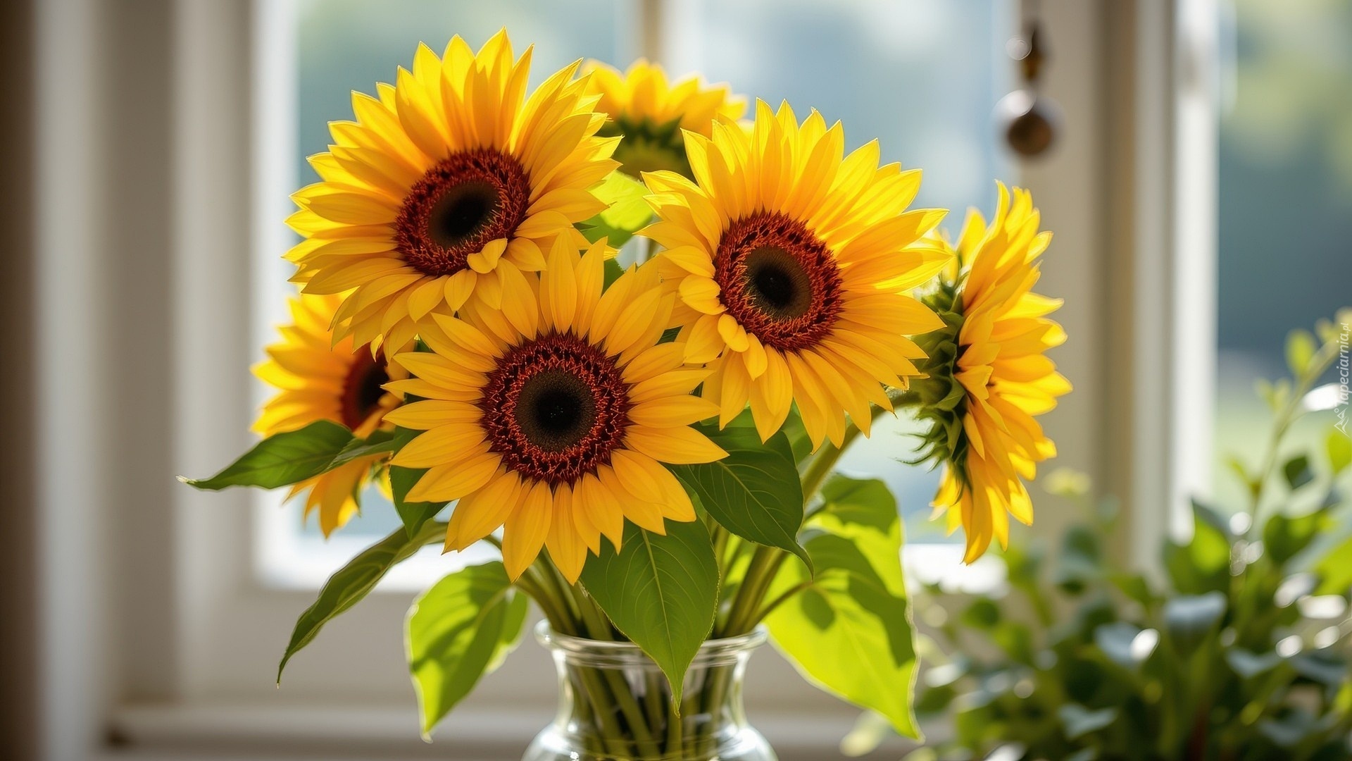 Edytor tapety: Słoneczniki w szklanym wazonie na tle okna
