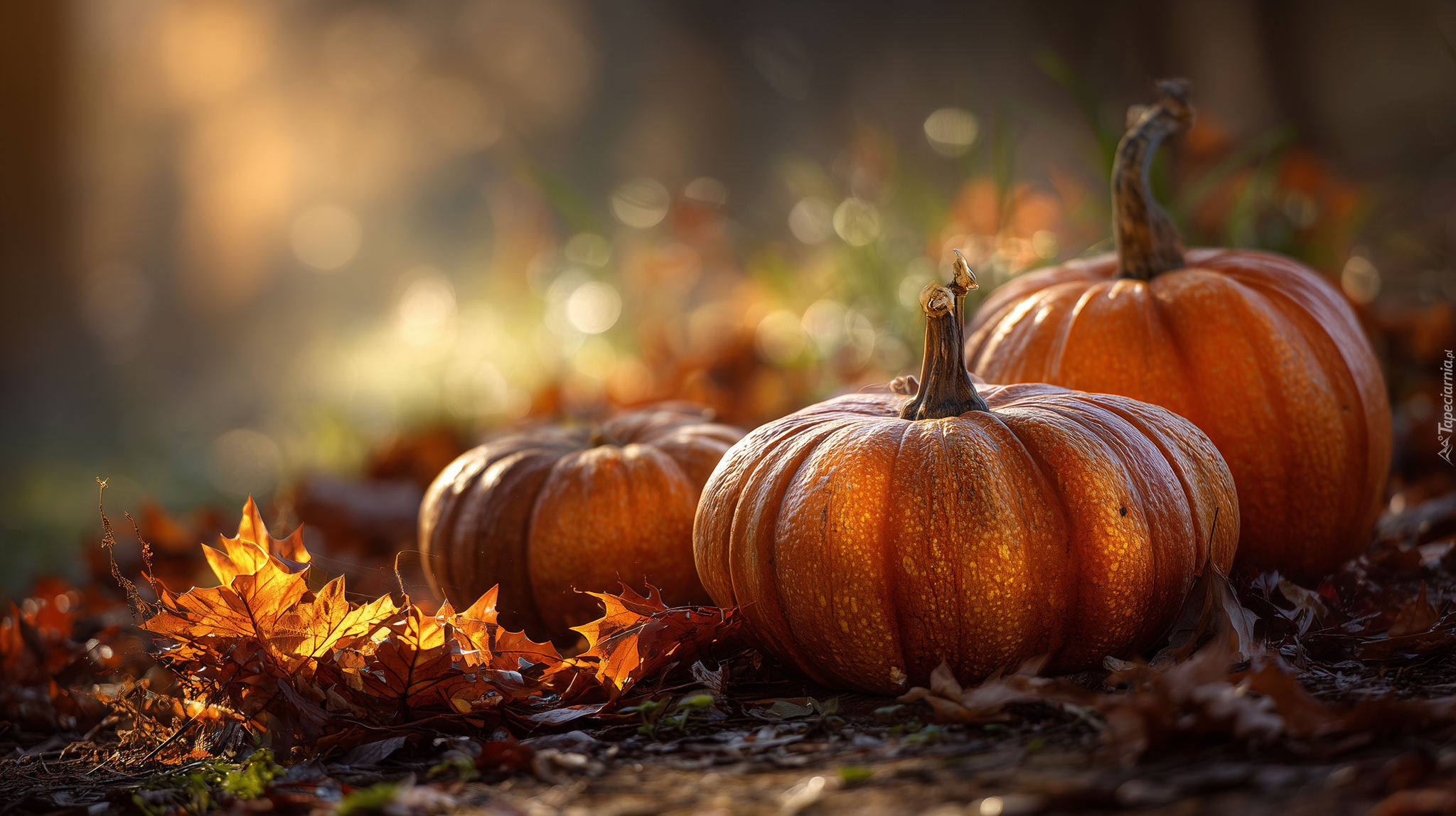 Edytor tapety: Rozświetlone trzy dynie na suchych jesiennych liściach