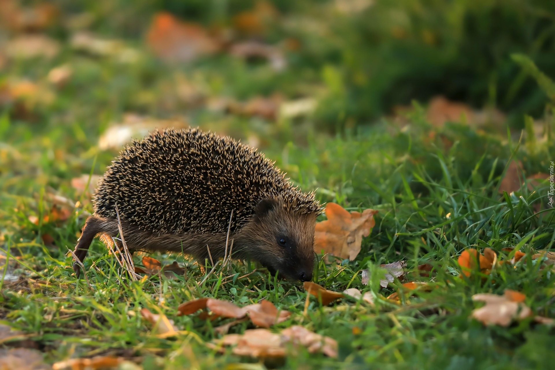 Edytor tapety: Jeż i pożółkłe liście na trawie