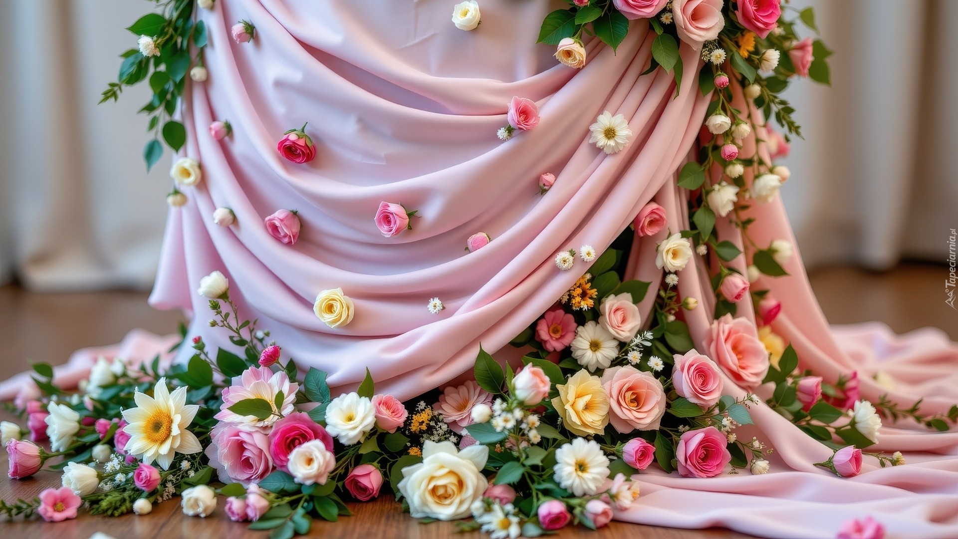 Edytor tapety: Kolorowe róże na różowym płótnie i obok