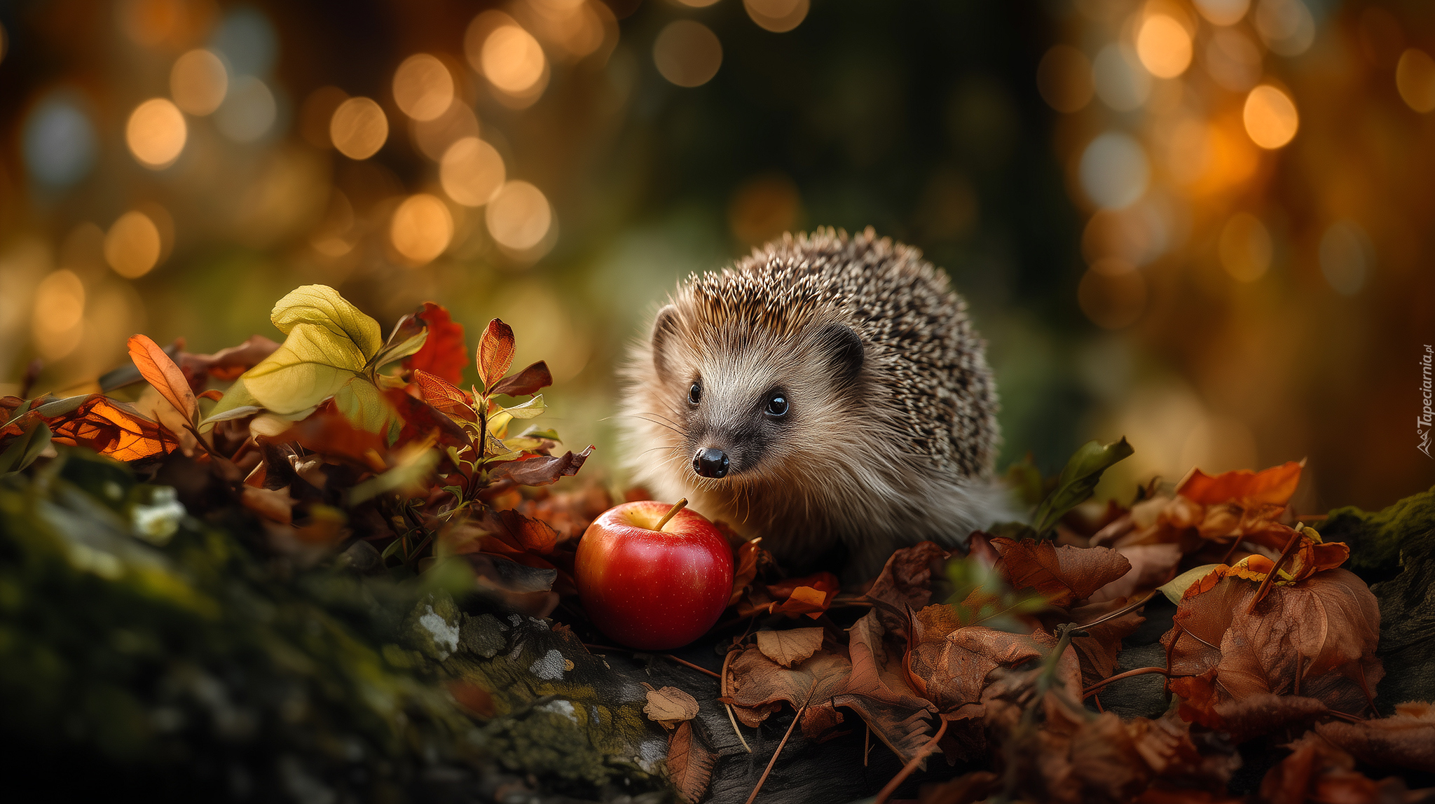 Edytor tapety: Jeż i czerwone jabłko na suchych jesiennych liściach