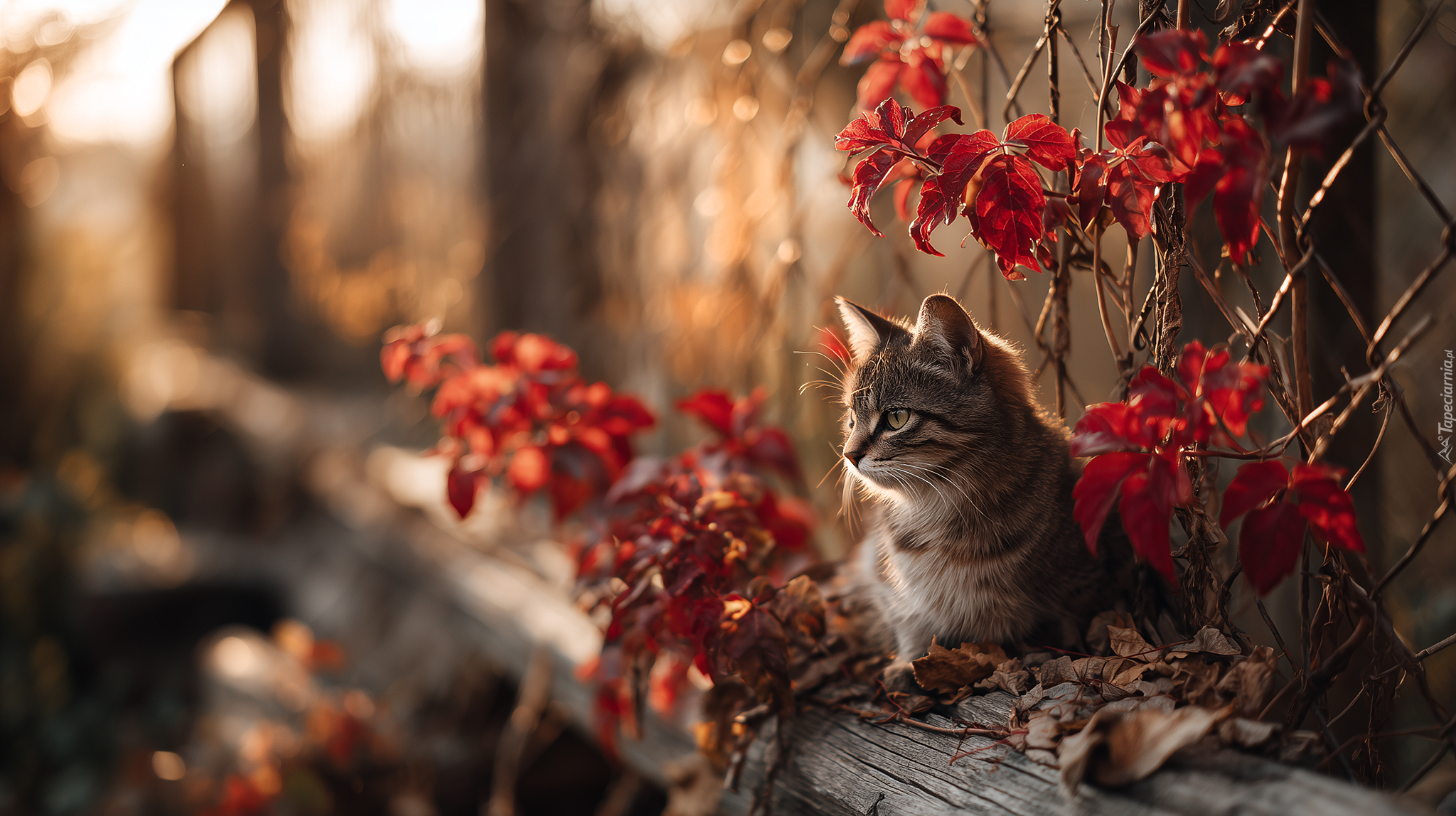 Edytor tapety: Szary kotek obok czerwonego winobluszczu na ogrodzeniu