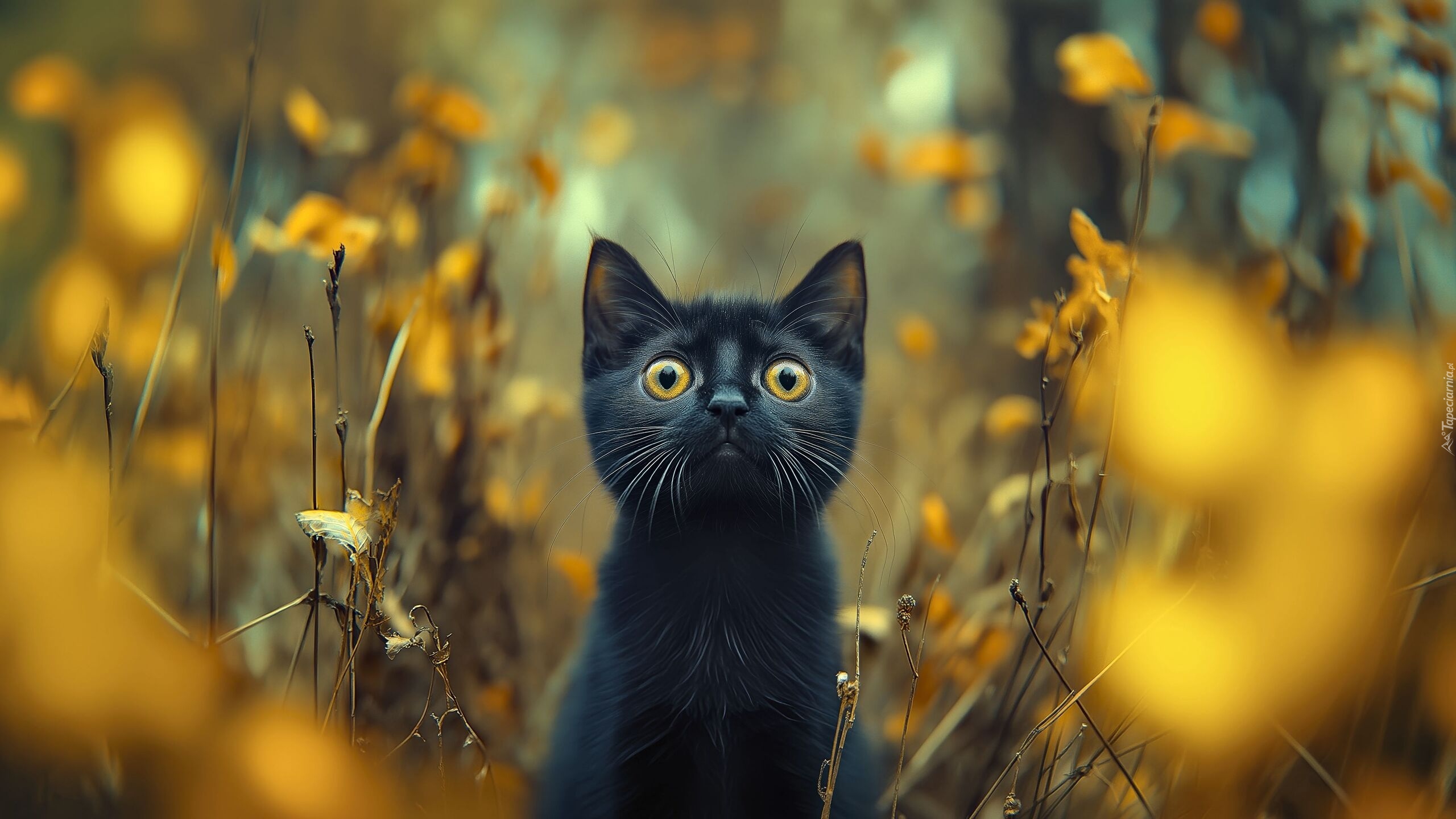 Edytor tapety: Siedzący czarny kot o miodowych oczach obok roślin