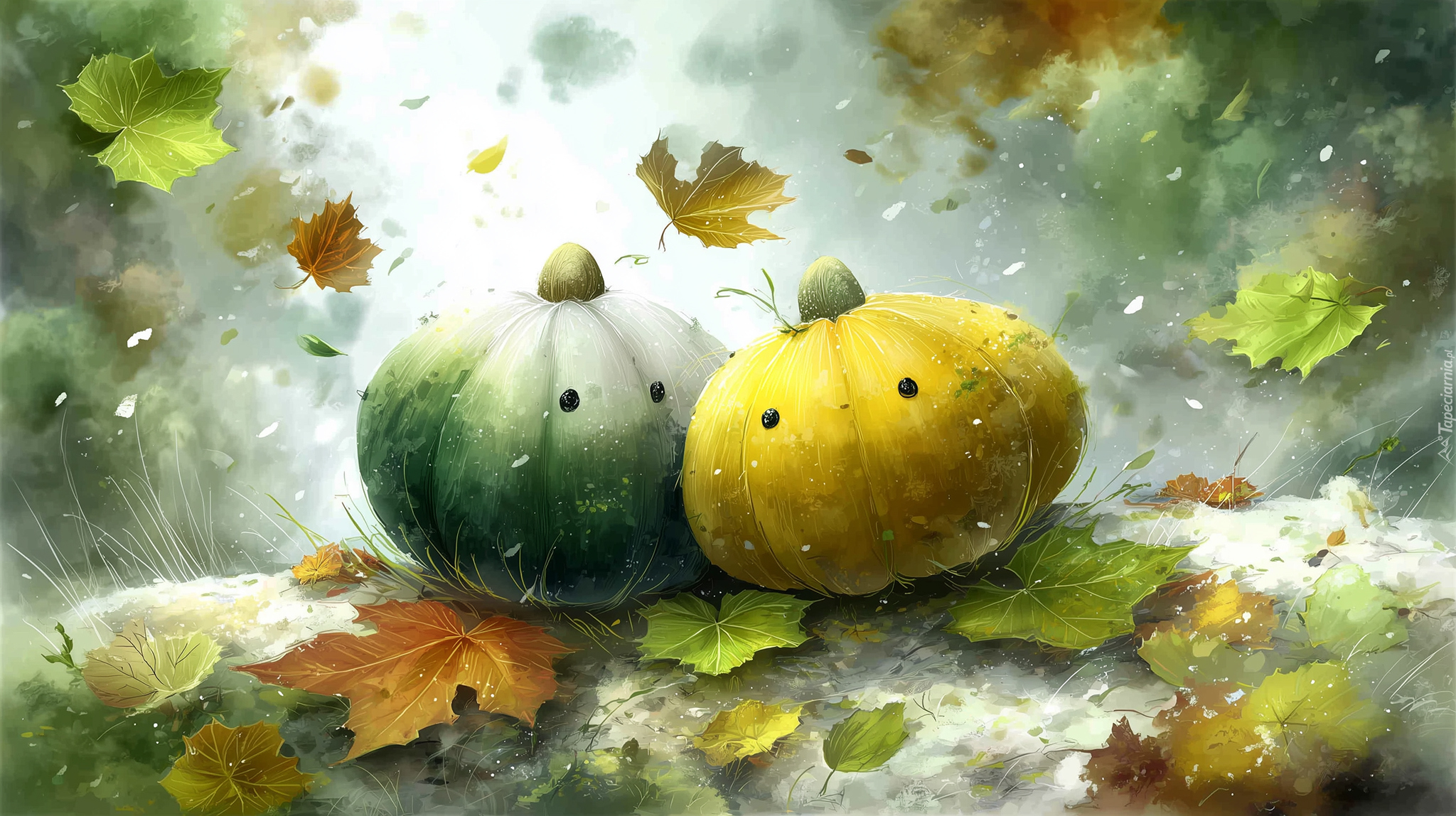 Edytor tapety: Dwie dynie i jesienne liście w grafice AI