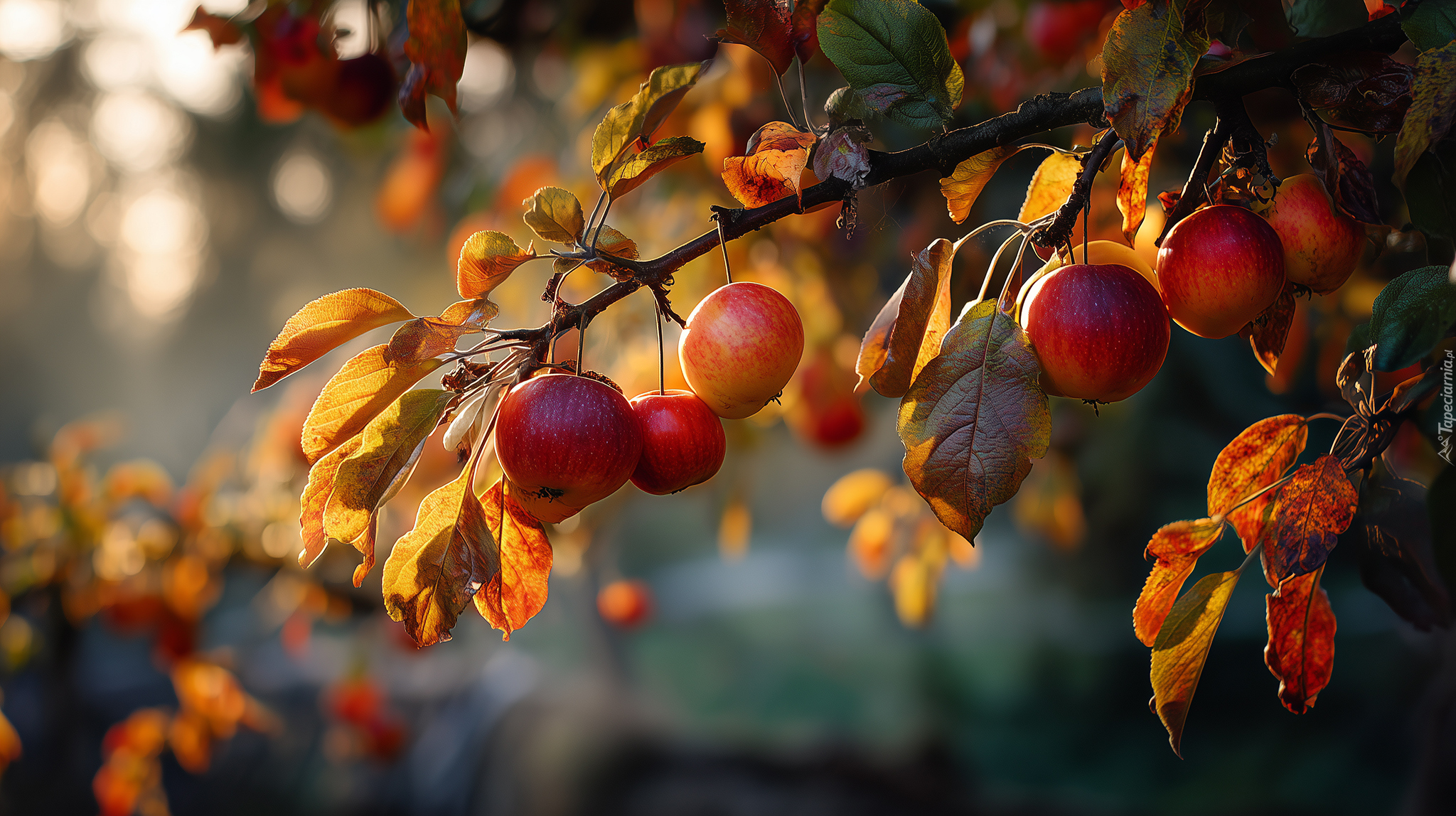 Edytor tapety: Rozświetlone czerwone jabłka na gałązce z jesiennymi liśćmi