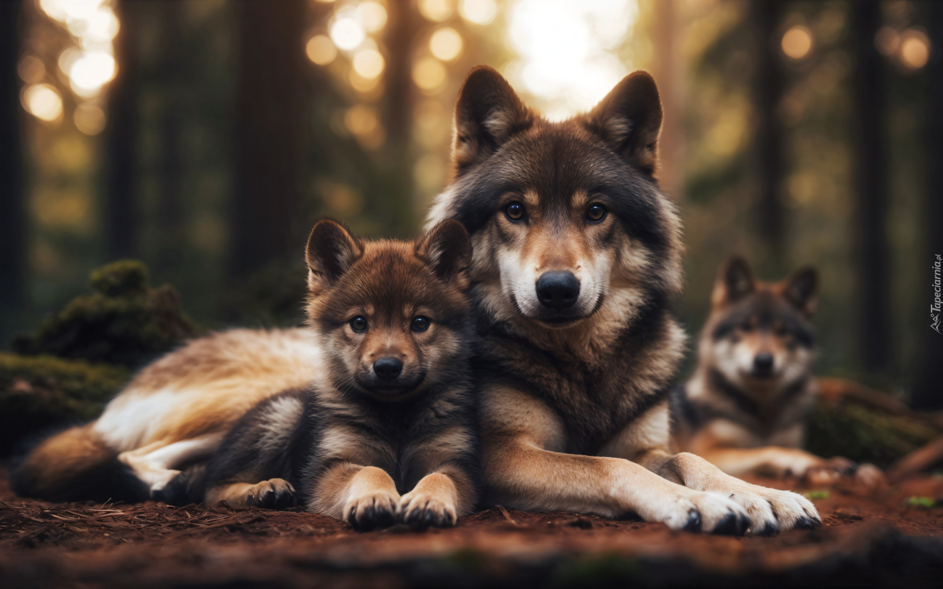 Edytor tapety: Leżąca wilczyca z dwoma wilczkami na tle drzew
