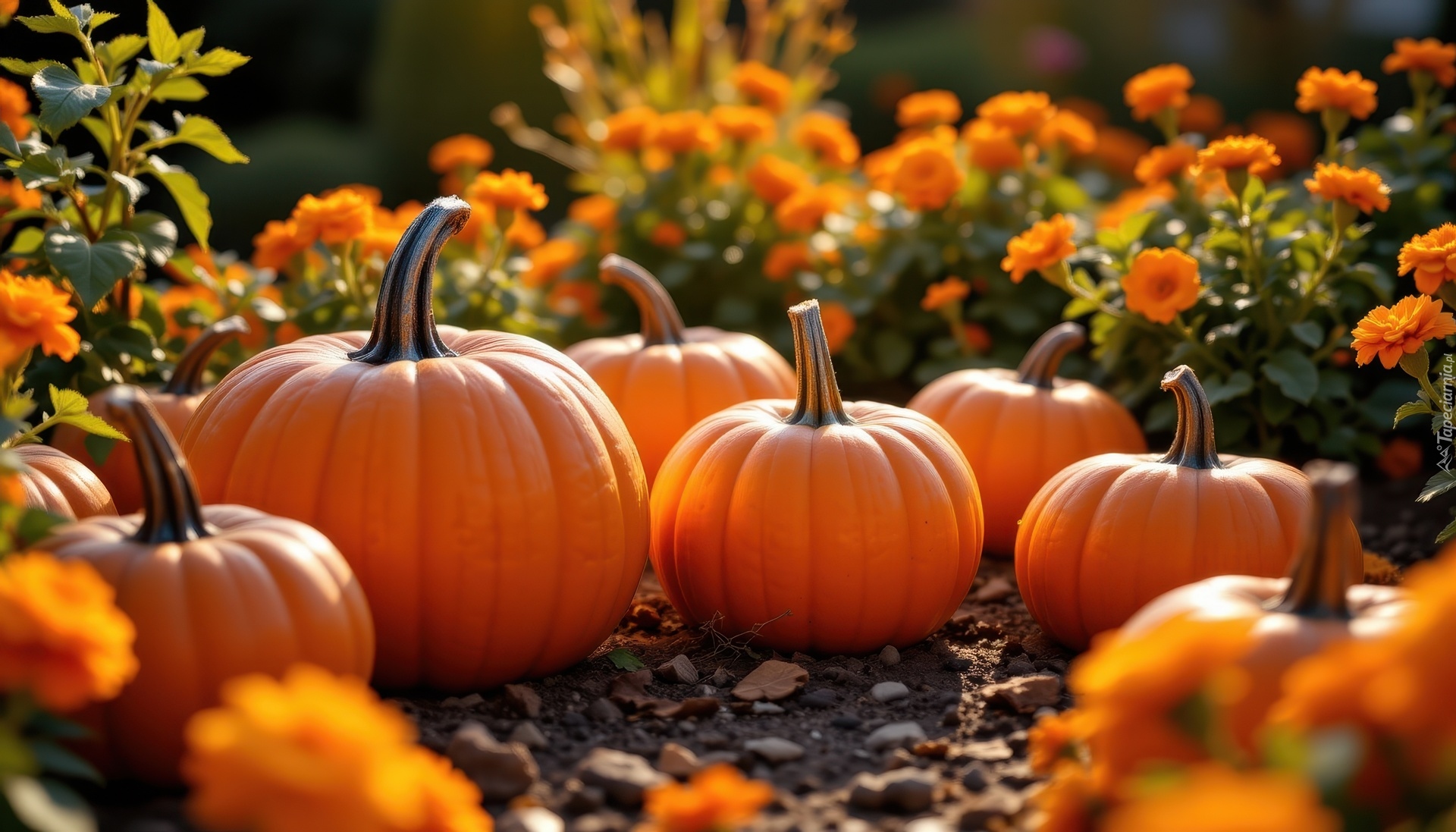 Edytor tapety: Rozświetlone światłem dynie i pomarańczowe kwiaty w ogrodzie