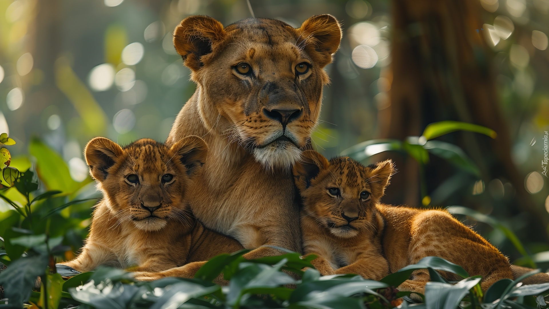 Edytor tapety: Lwica i dwa lwiątka leżące wśród roślin